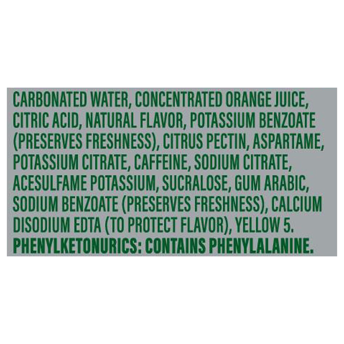 Carbonated Water, Concentrated Orange Juice, Citric Acid, Natural Flavor, Potassium Benzoate (Preserves Freshness), Citrus Pectin, Aspartame, Potassium Citrate, Caffeine, Sodium Citrate, Acesulfame Po…