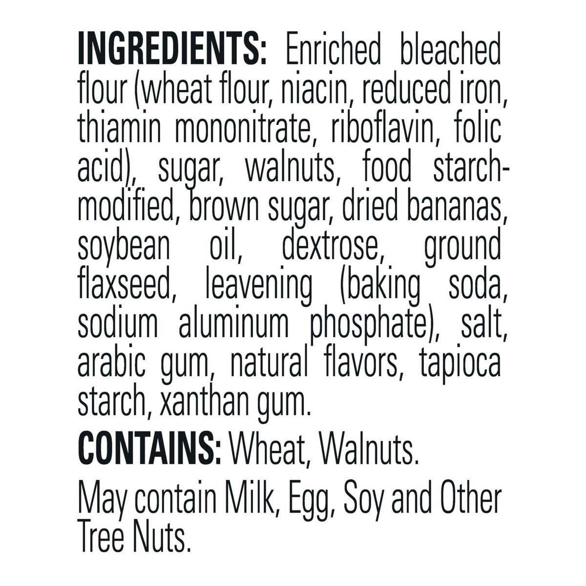 Enriched Bleached Flour (Wheat Flour, Niacin, Reduced Iron, Thiamin Mononitrate, Riboflavin, Folic Acid), Sugar, Walnuts, Food Starchmodified, Brown Sugar, Dried Bananas, Soybean Oil, Dextrose, Ground…