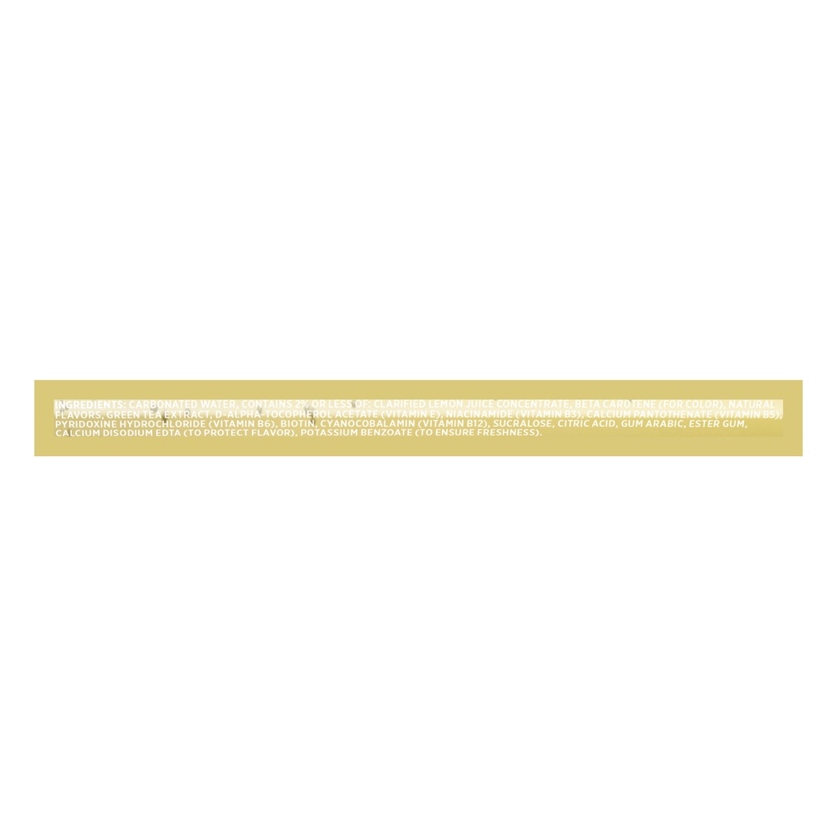 Carbonated Water, Contains 2% or Less of: Clarified Lemon Juice Concentrate, Beta Carotene (for Color), Natural Flavors, Green Tea Extract, D-Alpha-Tocopherol Acetate (Vitamin E), Niacinamide (Vitamin…
