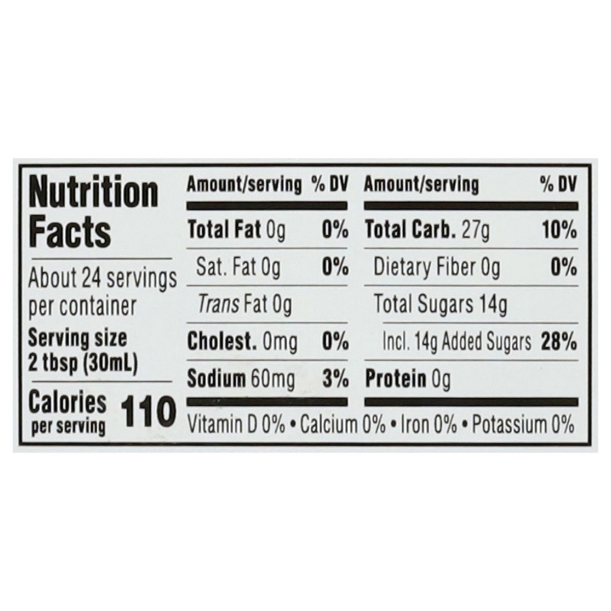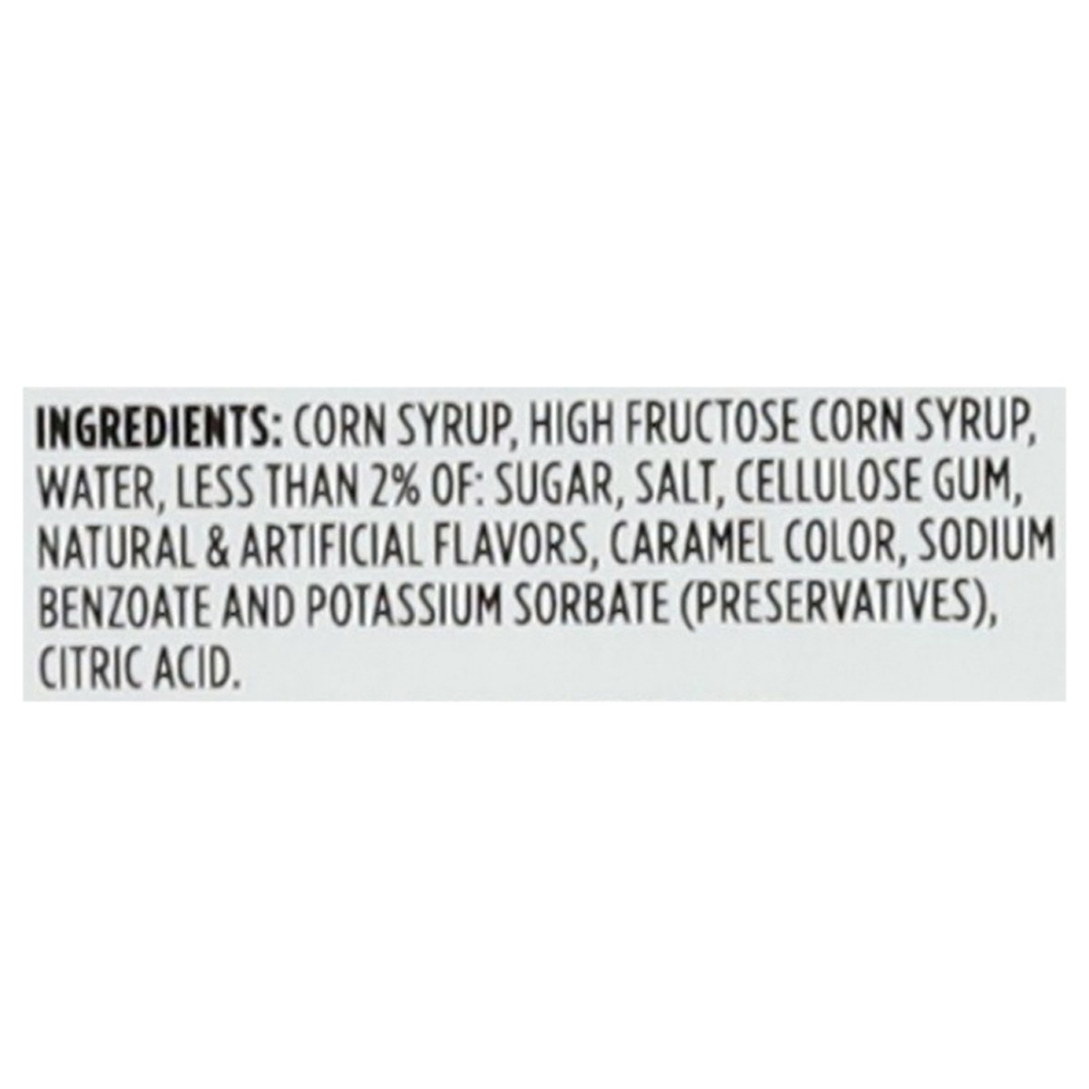 Corn Syrup, High Fructose Corn Syrup, Water, Less than 2% of: Sugar, Salt, Cellulose Gum, Natural & Artificial Flavors, Caramel Color, Sodium Benzoate and Potassium Sorbate (Preservatives), Citric Aci…