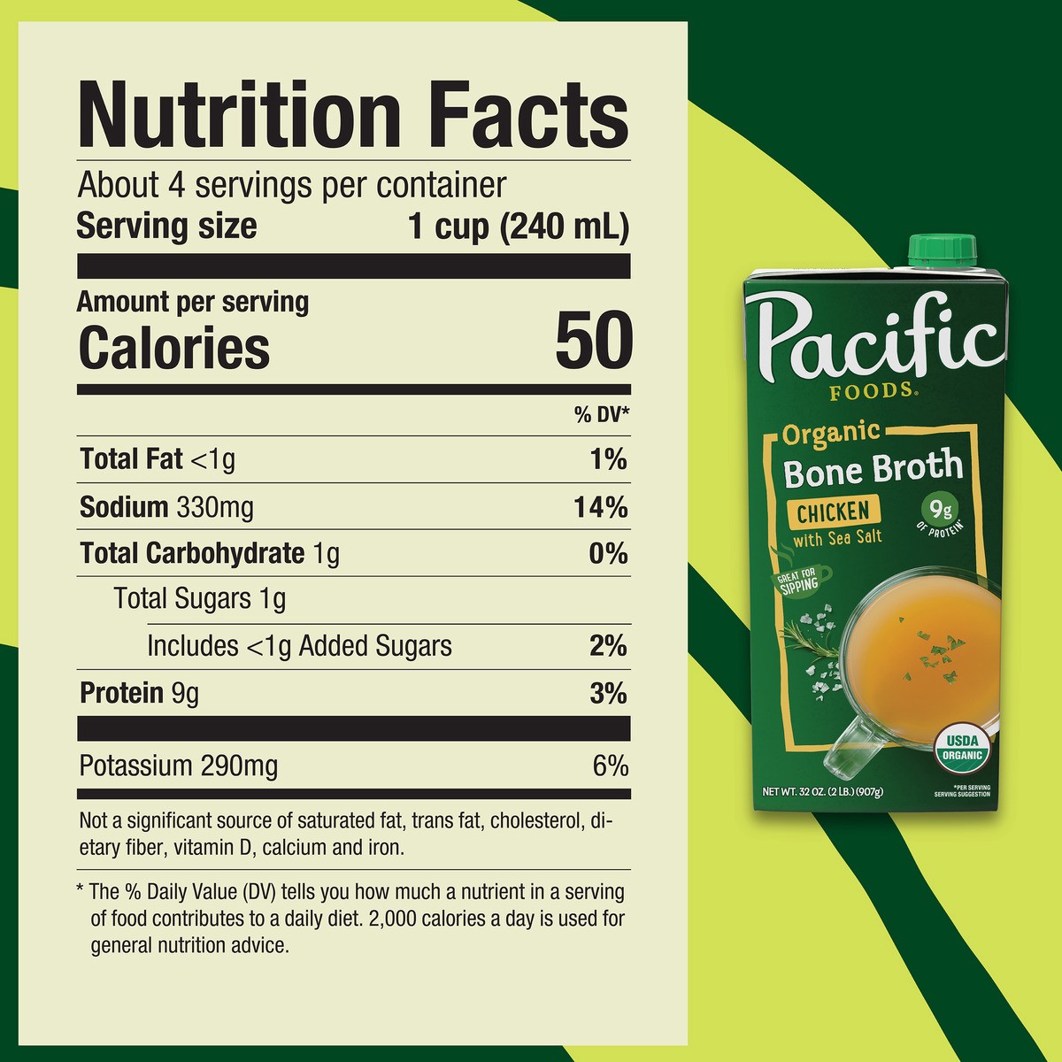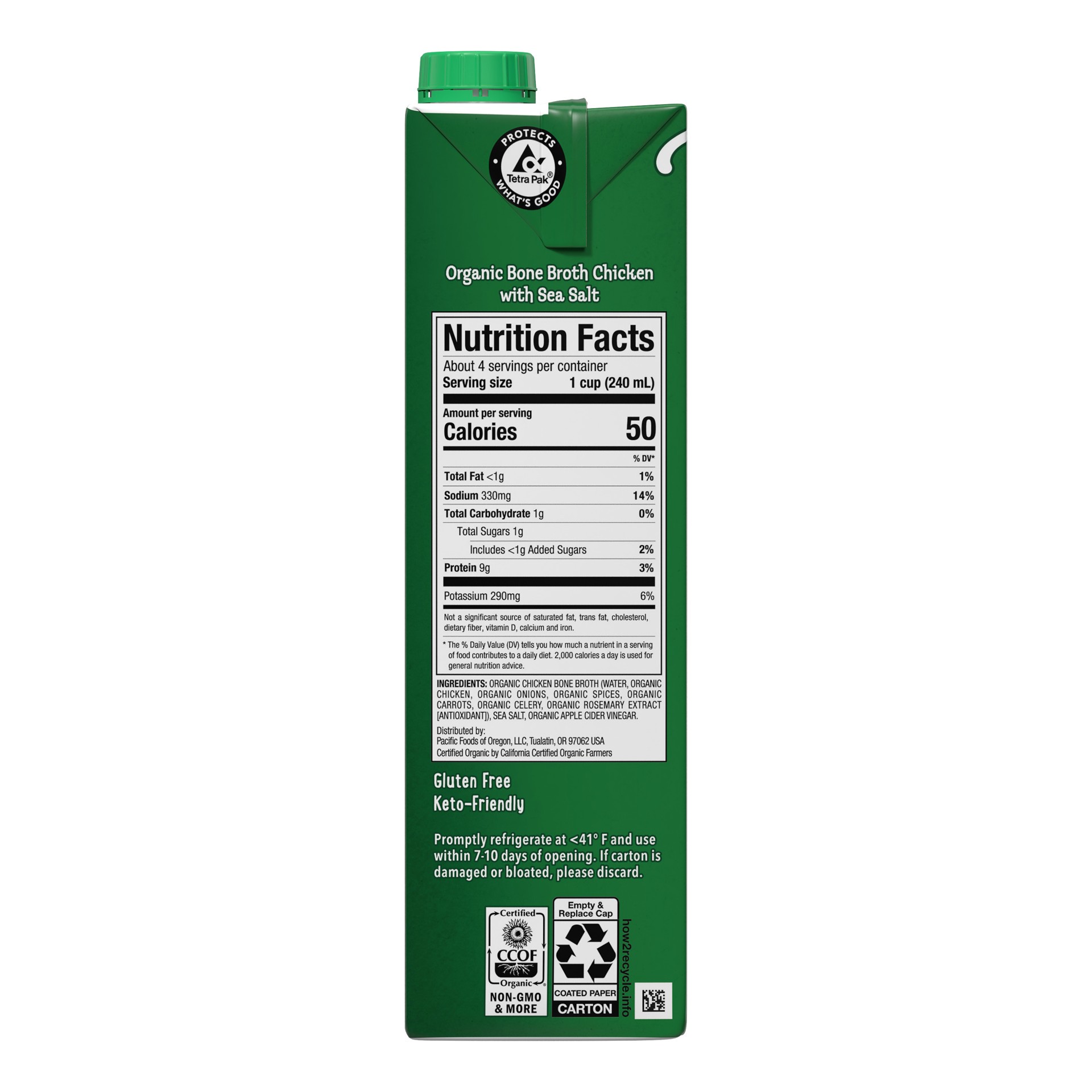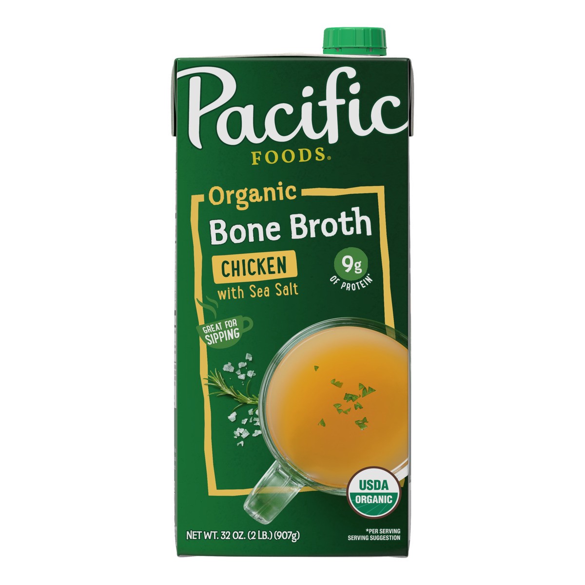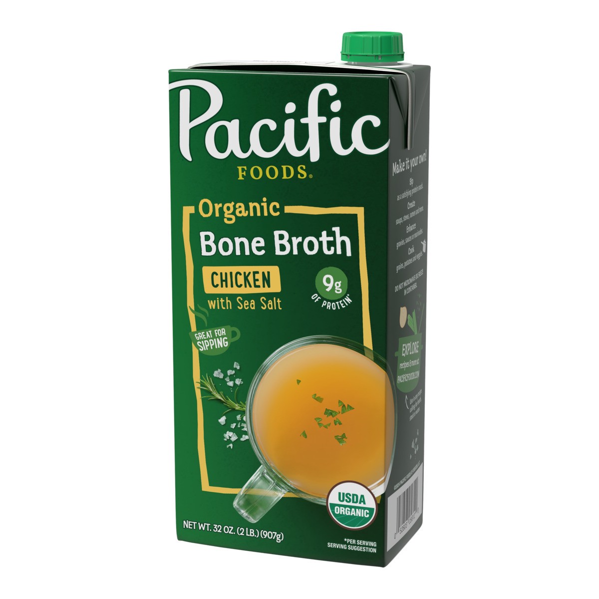 Experience layers of nourishing flavor with Pacific Foods Organic Chicken Bone Broth With Sea Salt. We slow-simmer organic chicken bones with vegetables, rosemary, apple cider vinegar and a pinch of s…