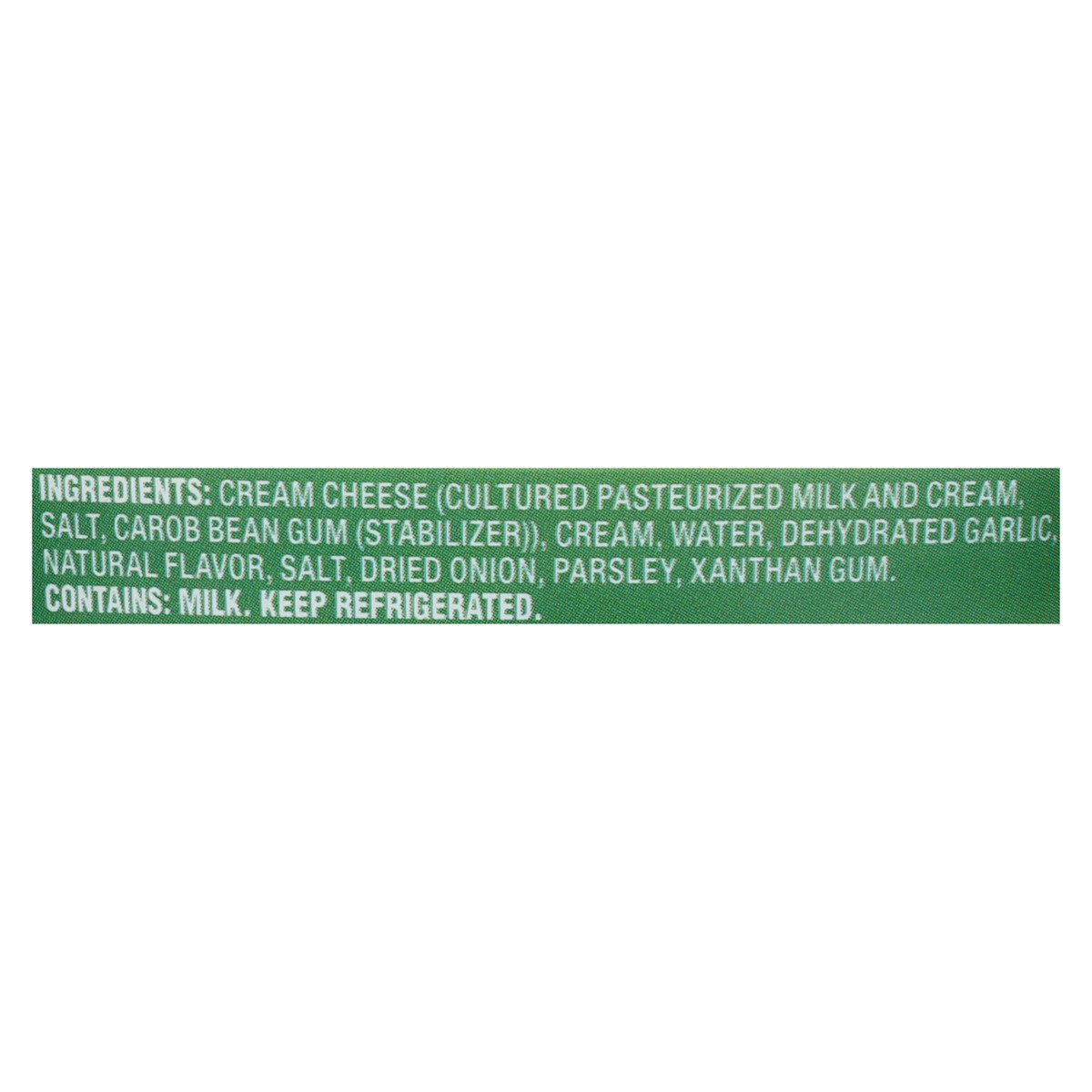 Cream Cheese (Cultured Pasteurized Milk and Cream, Salt, Carob Bean Gum (Stabilizer)), Cream, Water, Dehydrated Garlic, Natural Flavor, Salt, Dried Onion, Parsley, Xanthan Gum.