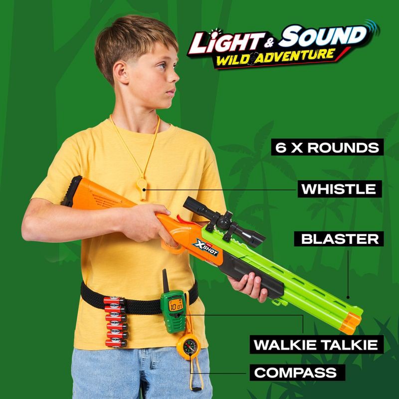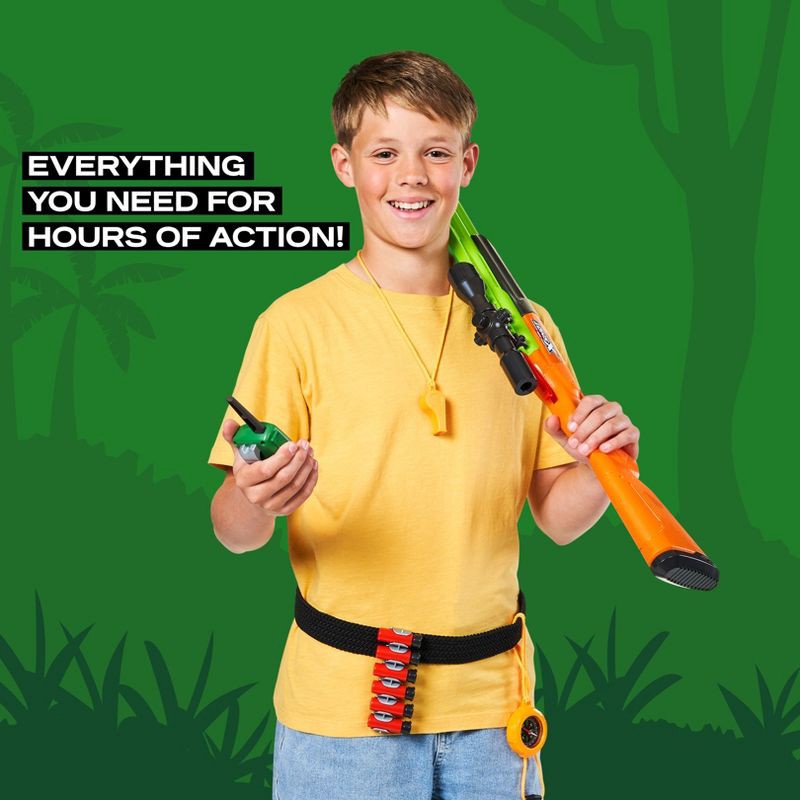 - COMPLETE OUTDOOR ADVENTURE KIT – Includes non-firing blaster, scope, 6 ejecting rounds, walkie talkie, compass & whistle for immersive play.