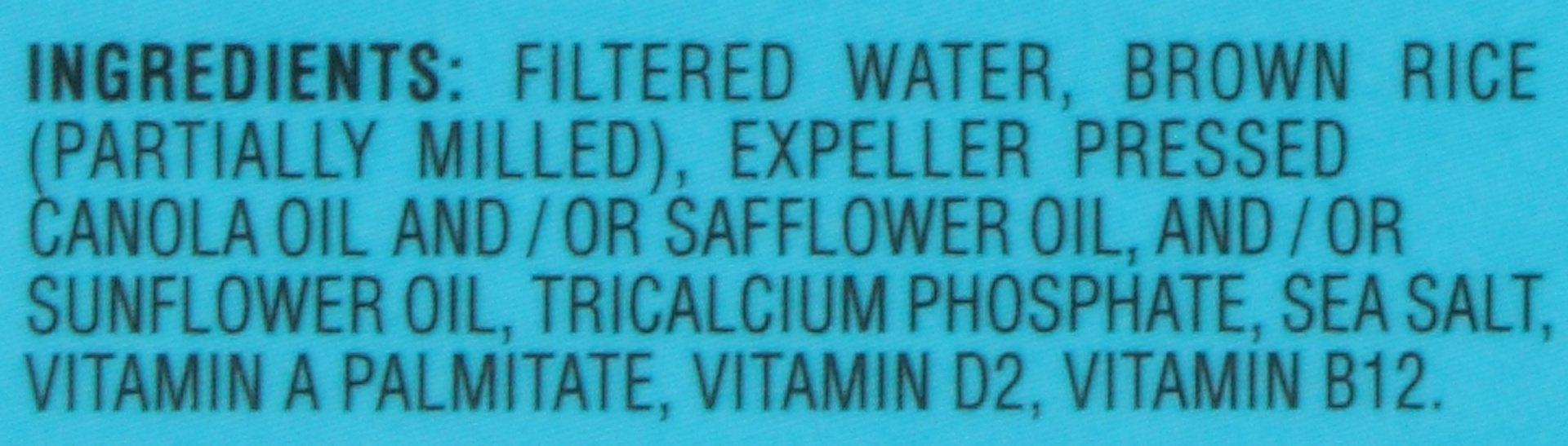 Ingredients: Water, Rice, Safflower Oil And/or Canola Oil And/or Sunflower Oil, Tricalcium Phosphate, Sea Salt, Vitamin A Palmitate, Vitamin D2, Vitamin B12