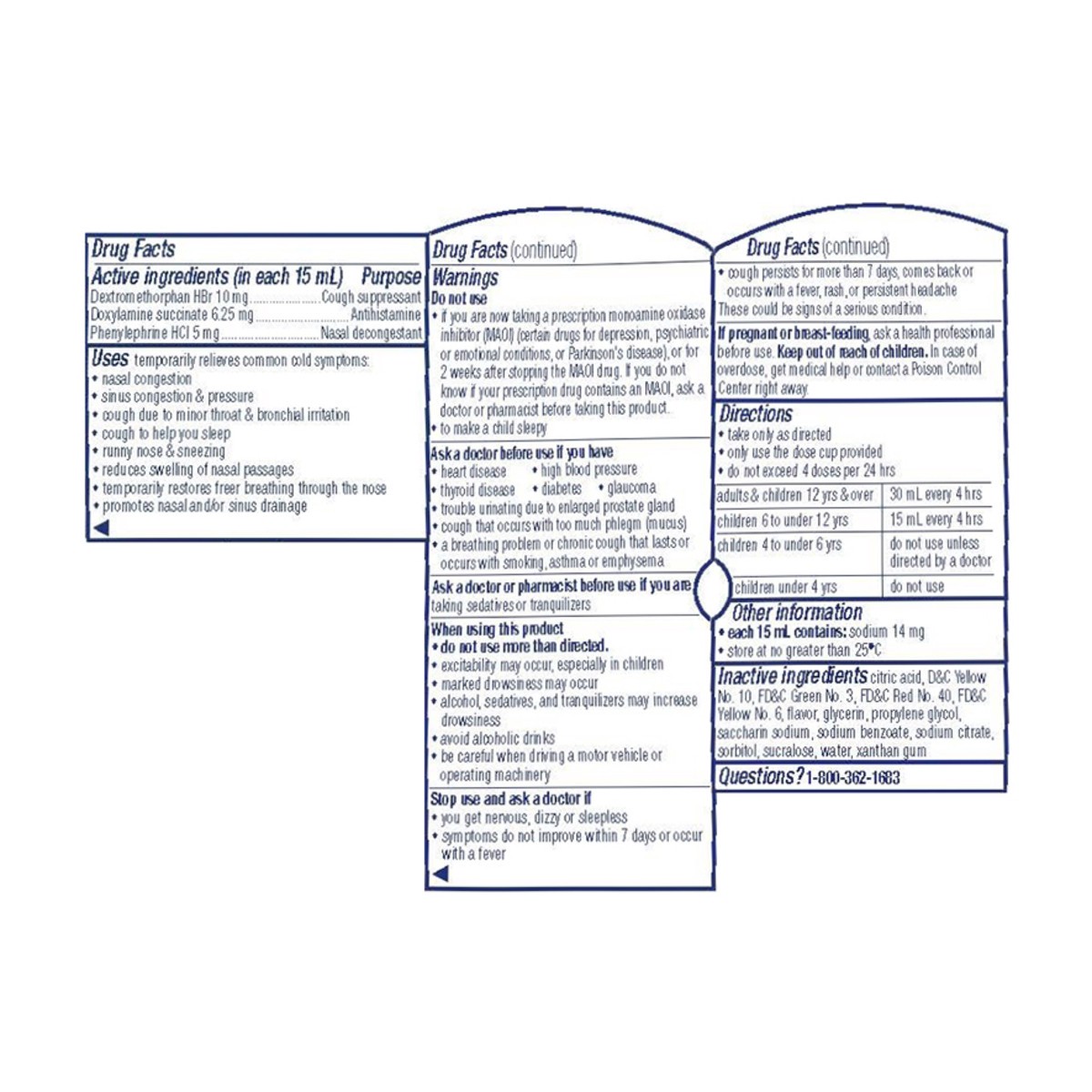 In Each 15 mL Active Ingredients: Dextromethorphan HBr (10 mg), Cough Suppressant; Guaifenesin (100 mg), Expectorant; Phenylephrine HCl (5 mg), Nasal Decongestant. Inactive Ingredients: Citric Acid, D…
