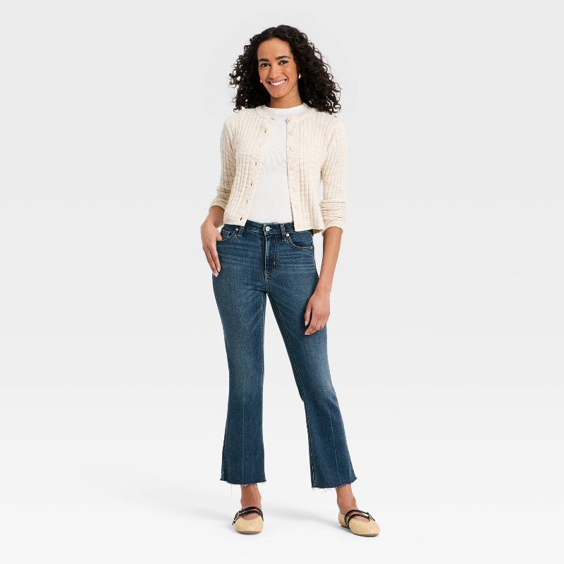 Spruce up your casual wardrobe with these High-Rise Kick Flare Jeans from Universal Thread™. Made from a fabric blend of cotton, recycled polyester and elastane, these high-rise jeans offer comfortabl…