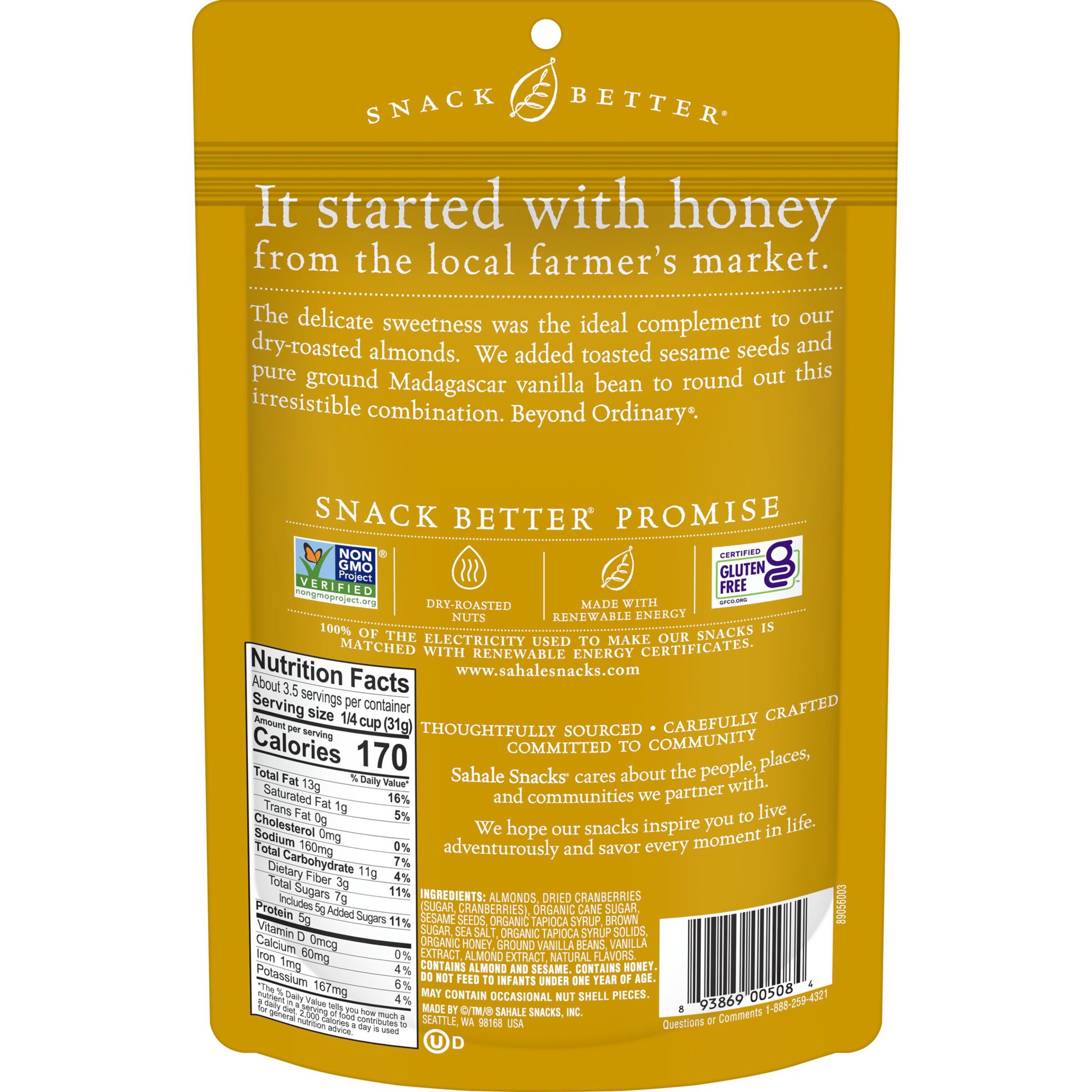 Almonds, Dried Cranberries (sugar, Cranberries), Organic Cane Sugar, Sesame Seeds, Organic Tapioca Syrup, Brown Sugar, Sea Salt, Organic Tapioca Syrup Solids, Organic Honey, Ground Vanilla Beans, Vani…