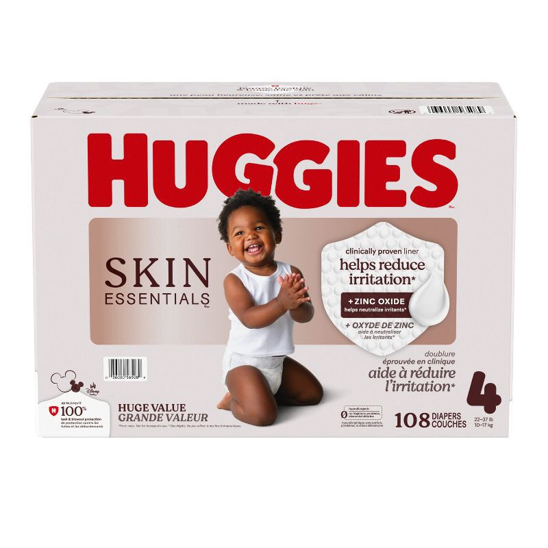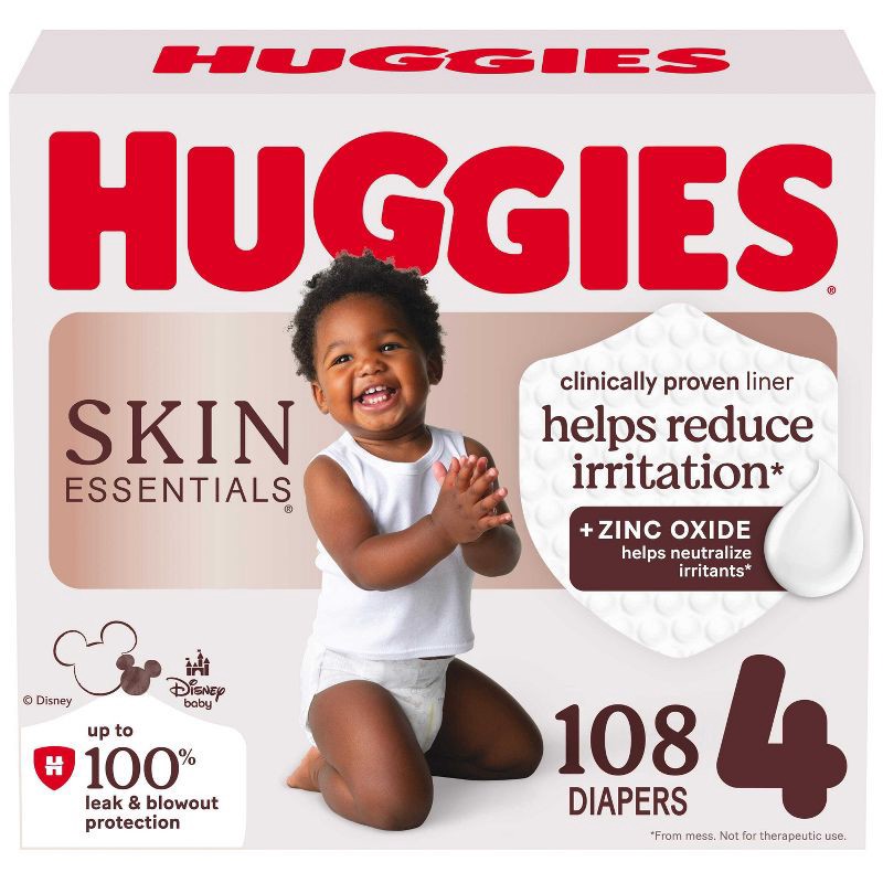 - Huggies Size 4 Diapers: 108 Huggies Skin Essentials Baby Diapers, size 4 (22-37 lbs)