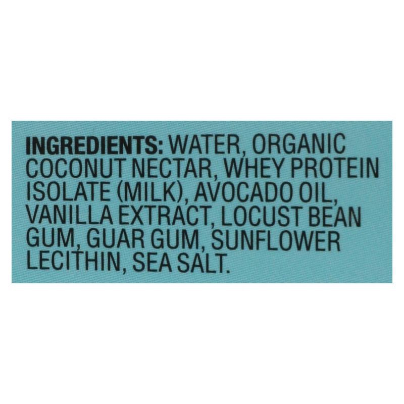 WATER, ORGANIC COCONUT NECTAR, WHEY PROTEIN ISOLATE (MILK), AVOCADO OIL VANILLA EXTRACT, LOCUST BEAN GUM, GUAR GUM, SUNFLOWER LECITHIN, SEA SALT.