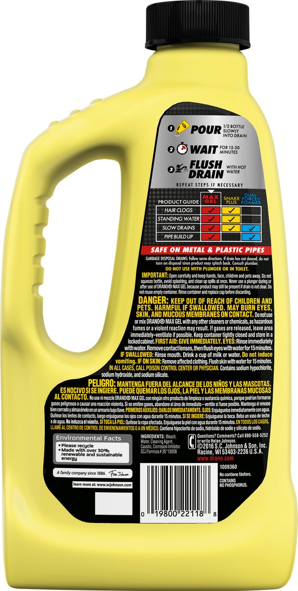 The thick bleach formula in Drano Max Gel, Commercial Line, Clog Remover cuts right through standing water, clinging to your toughest clogs to blast them fast. Its pro strength formula works great to …