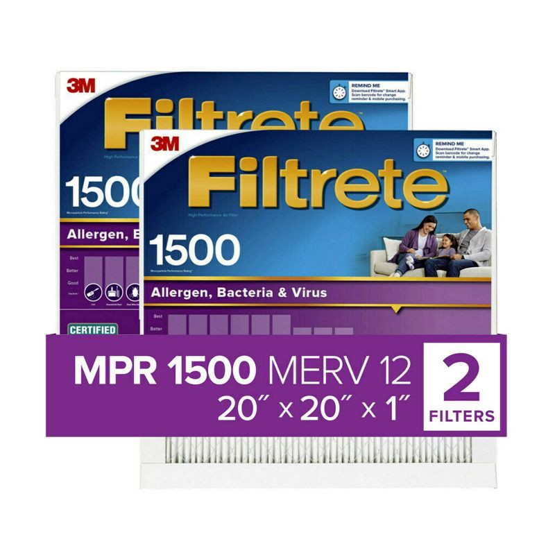 Filtrete 20x20x1 2pk Allergen Bacteria and Virus Air Filter 1500 MPR: Electrostatic Furnace Filter, MERV 12, Captures Dust & Pollen