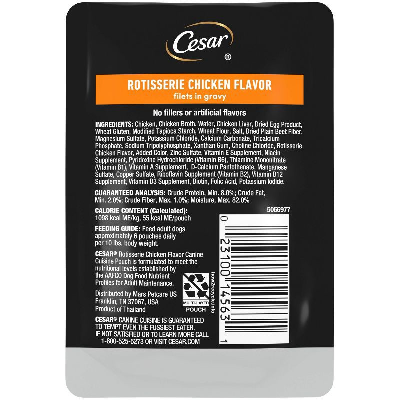 - Single: Contains one (1) 1.76 oz. Mini-Pouch of Cesar Filets in Gravy Wet Dog Food Rotisserie Chicken Flavor.