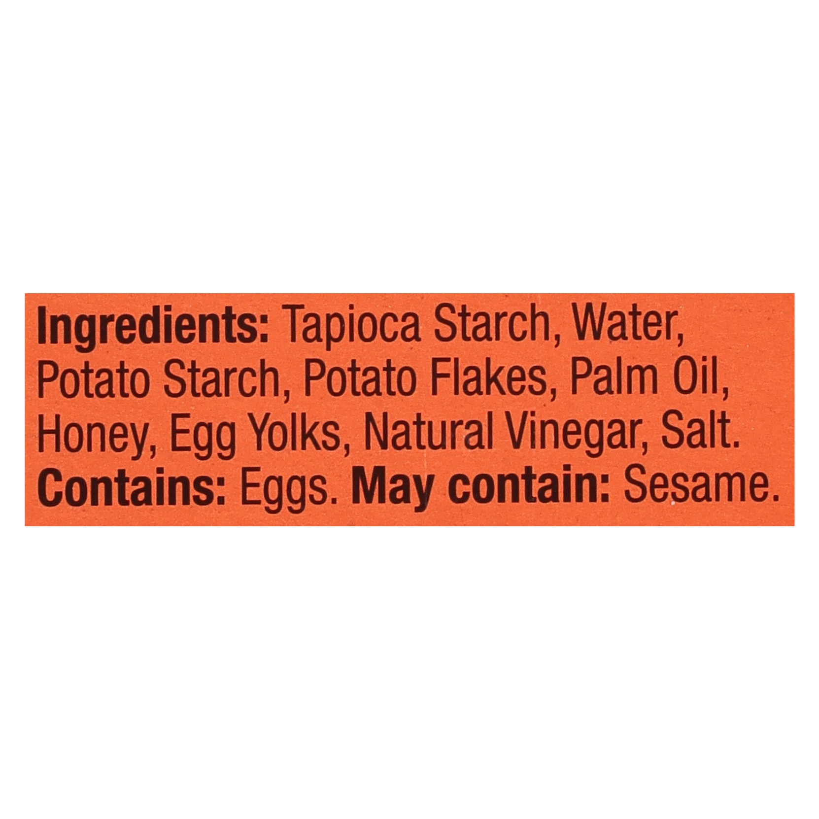 Tapioca Starch, Water, Potato Starch, Potato Flakes, Palm Oil, Honey, Egg Yolks, Onion Flakes, Natural Vinegar, Onion Powder, Salt.