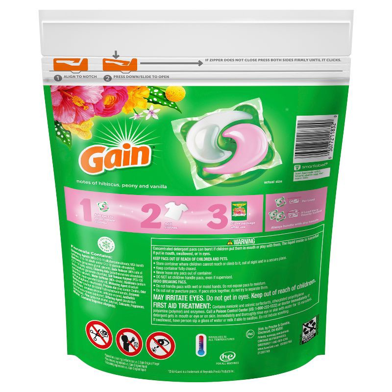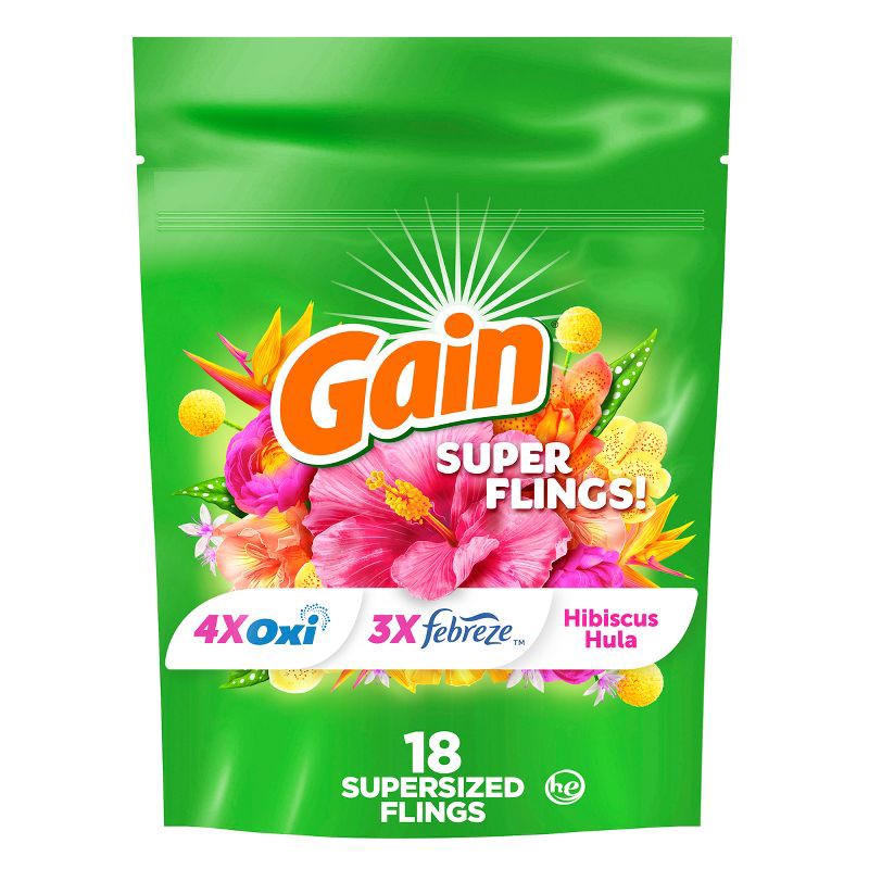 - Includes one package of Gain Super Flings Laundry Detergent Pacs 18 Count in Hibiscus Hula scent