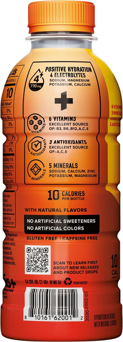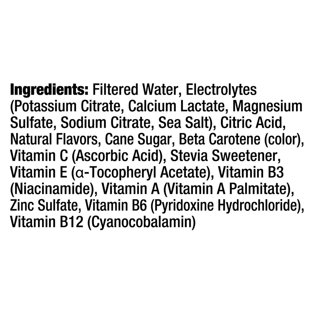 Filtered Water, Electrolytes (Potassium Citrate, Calcium Lactate, Magnesium Sulfate, Sodium Citrate, Sea Salt), Citric Acid, Natural Flavors, Cane Sugar, Beta Carotene (Color), Vitamin C (Ascorbic Aci…