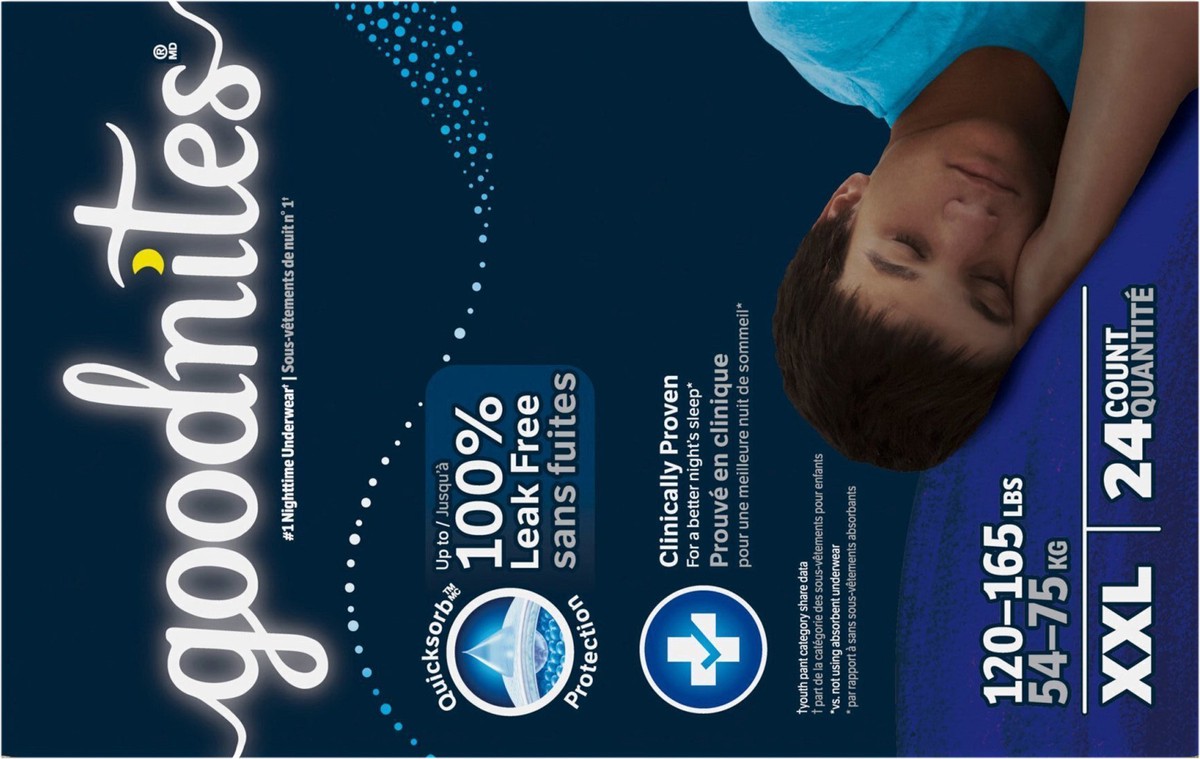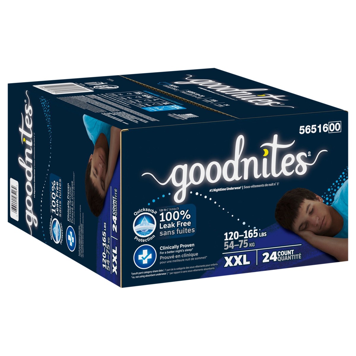 Help your kids wake up dry with Goodnites Nighttime Underwear, the #1 nighttime underwear,* now available in a new XXL size! These nighttime underwear are made with Quicksorb Protection for up to 100%…