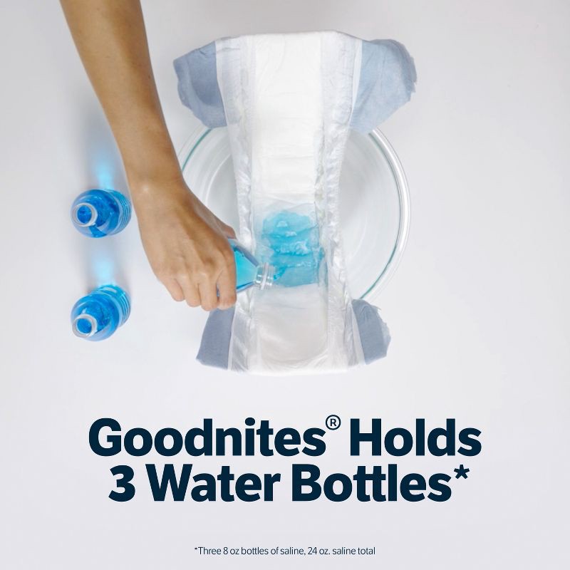 - Goodnites Nighttime Underwear holds three water bottles*** (***Three 8 oz bottles of saline, 24 oz. saline total)