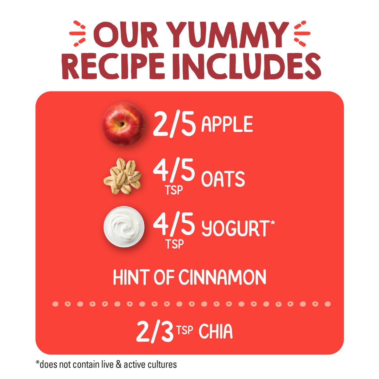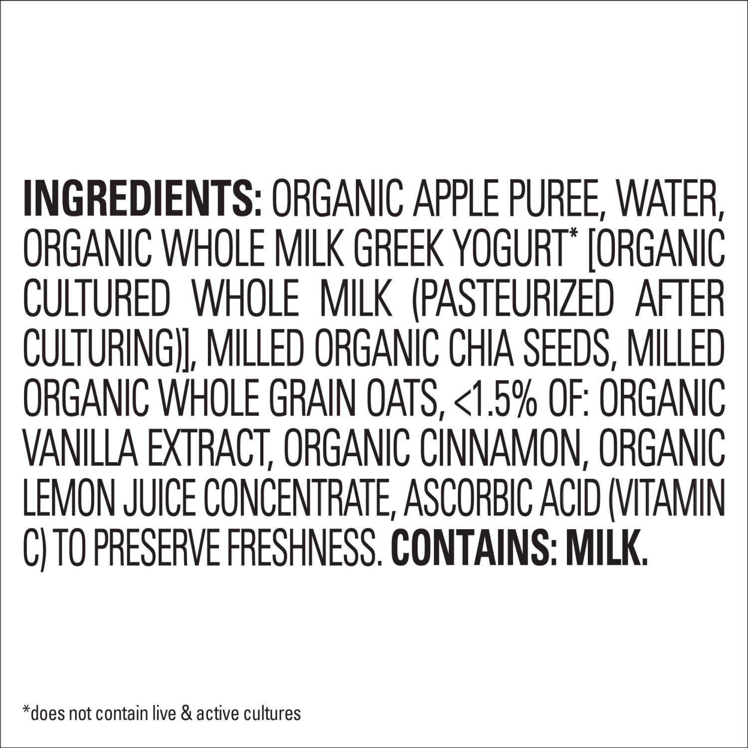 Organic Apple Puree, Water, Organic Whole Milk Greek Yogurt [Organic Cultured Whole Milk, (Pasteurized After Culturing)], Milled Organic Chia Seeds, Milled Organic Whole Grain Oats, <1.5% of: Organic …