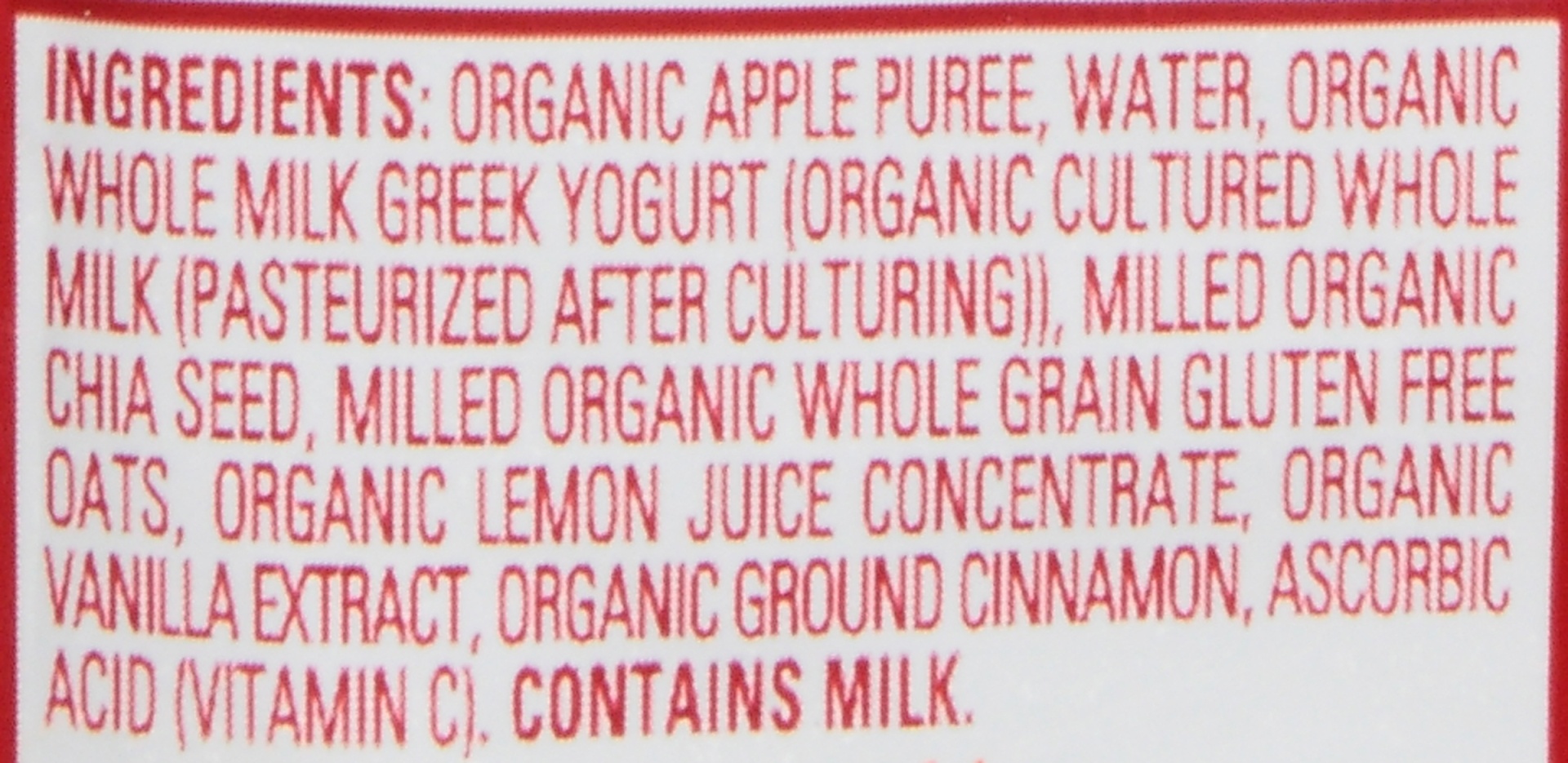 Apple Puree*, Water, Whole Milk Yogurt* (Cultured Whole Milk* [Pasteurized After Culturing]), Milled Chia Seeds*, Milled Whole Grain Oats*, <1.5% of: Vanilla Extract*, Cinnamon*, Lemon Juice Concentra…