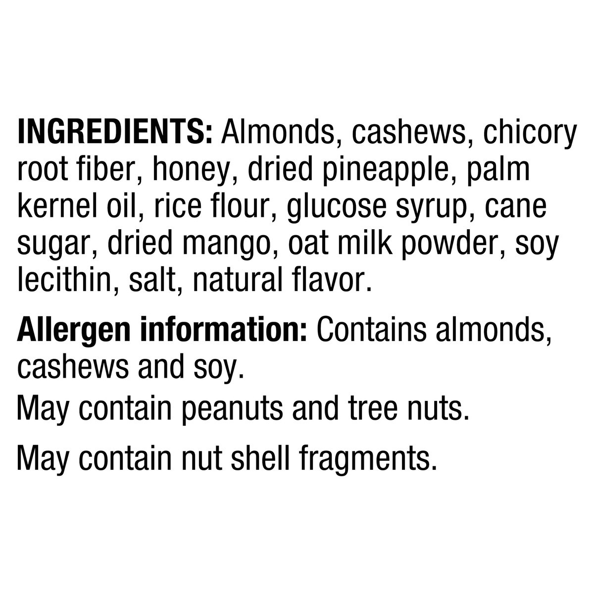 Almonds, Cashews, Chicory Root Fiber, Honey, Dried Pineapple, Palm Kernel Oil, Rice Flour, Glucose Syrup, Cane Sugar, Dried Mango, Oat Milk Powder, Soy Lecithin, Salt, Natural Flavor.