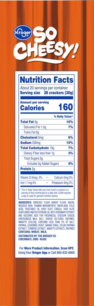 Enriched Flour (Wheat Flour, Niacin, Reduced Iron, Thiamin Mononitrate, Riboflavin, Folic Acid), High Oleic Canola Oil, Cheddar Cheese (Milk, Salt, Cheese Cultures, Enzymes, Annatto [Color]), Contains…