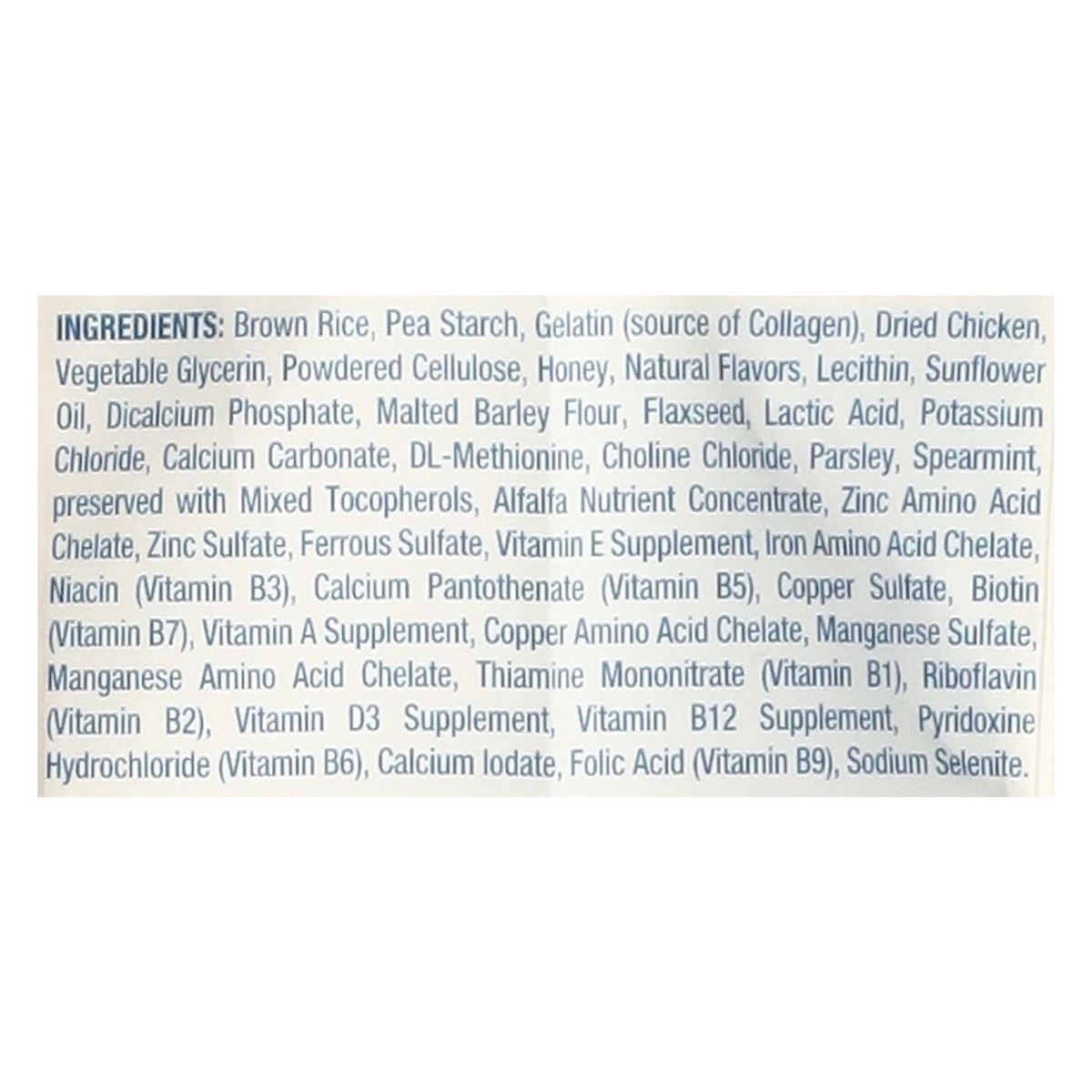 Brown Rice, Pea Starch, Gelatin (Source of Collagen), Dried Chicken, Vegetable Glycerin, Powdered Cellulose, Honey, Natural Flavors, Lecithin, Sunflower Oil, Dicalcium Phosphate, Malted Barley Flour, …