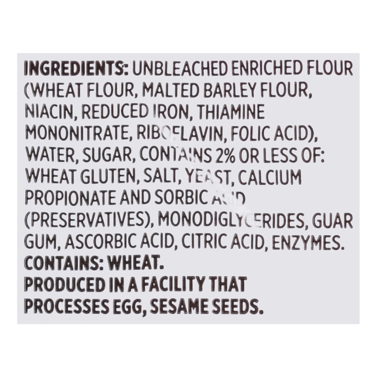 Unbleached Enriched Flour (Wheat Flour, Malted Barley Flour, Niacin, Reduced Iron, Thiamine Mononitrate, Riboflavin, Folic Acid), Water, Sugar, Contains 2% or Less of: (Preservatives), Monodiglyceride…