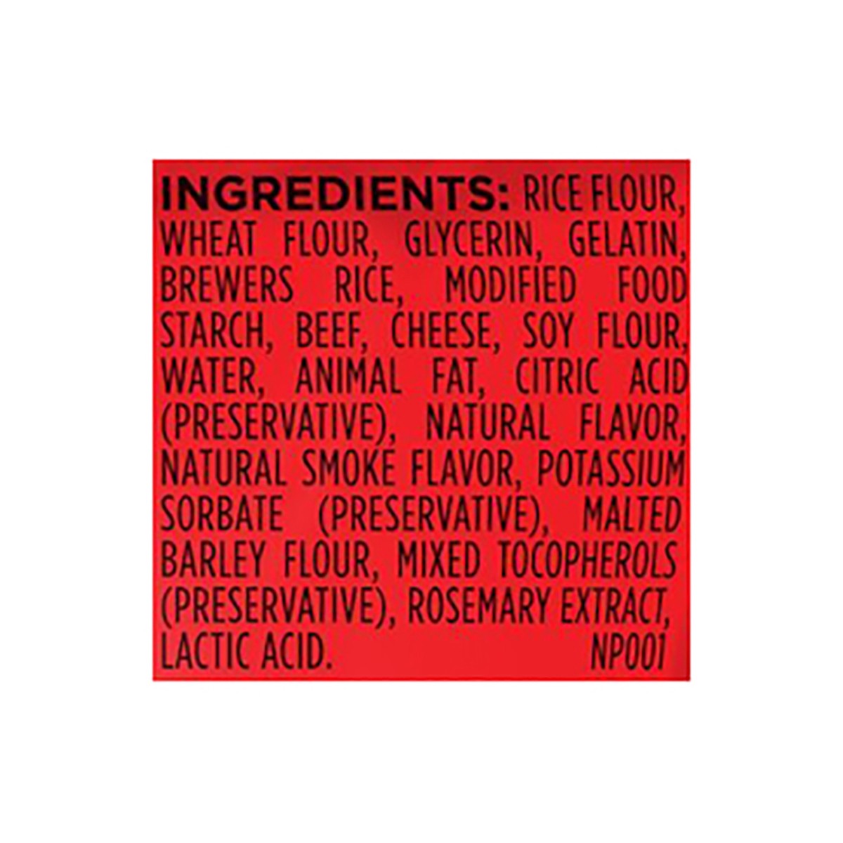 Rice Flour, Wheat Flour, Glycerin, Gelatin Brewers Rice, Modified Food Starch, Beef, Cheese, Soy Flour, Water Animal Fat, Citric Acid (Preservative), Natural Flavor Natural Smoke Flavor, Potassium Sor…