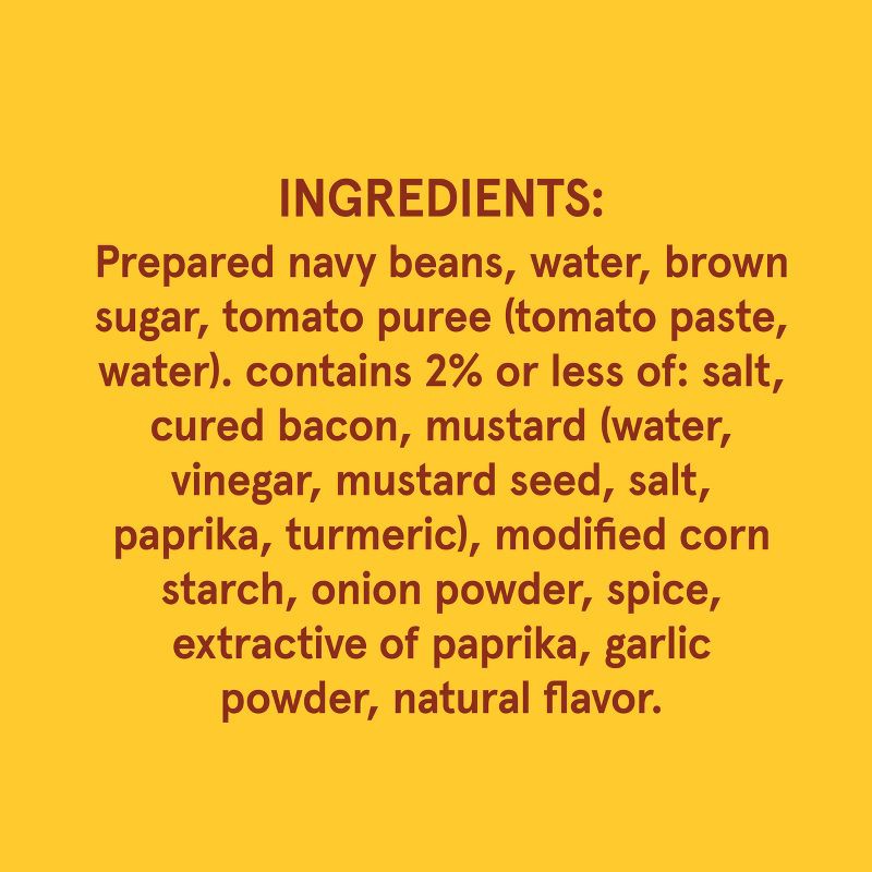 Prepared Navy Beans, Water, Brown Sugar, Tomato Puree (Tomato Paste, Water), Contains 2% or Less of: Cured Bacon, Salt, Mustard (Water, Vinegar, Mustard Seed, Salt, Paprika, Turmeric), Modified Corn S…