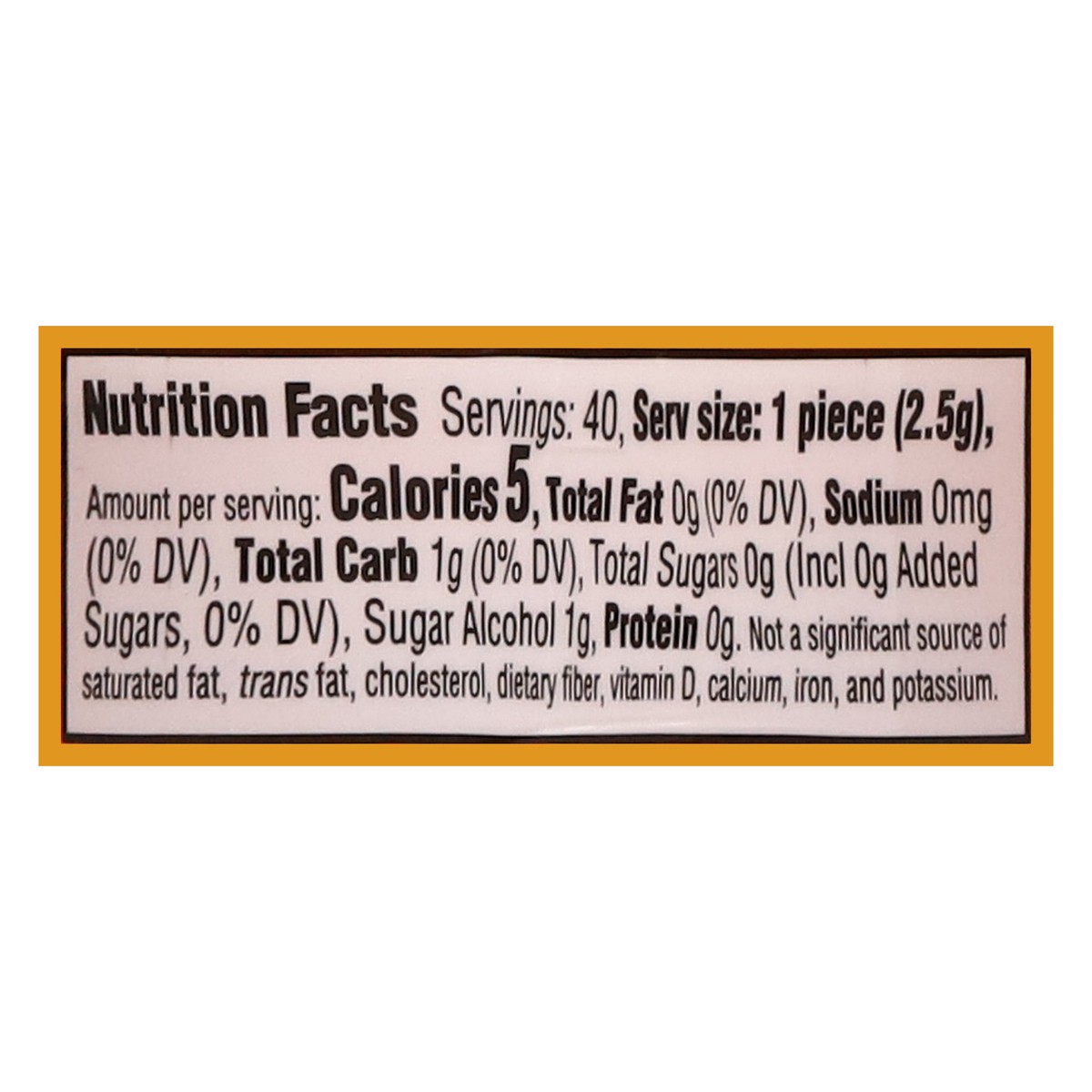 Natural and artificial flavor. 5 calories per piece. Sugar free gum. 35% fewer calories than sugared gum. Calorie content for this serving size has been reduced from 8 to 5 calories. Contains a bioeng…