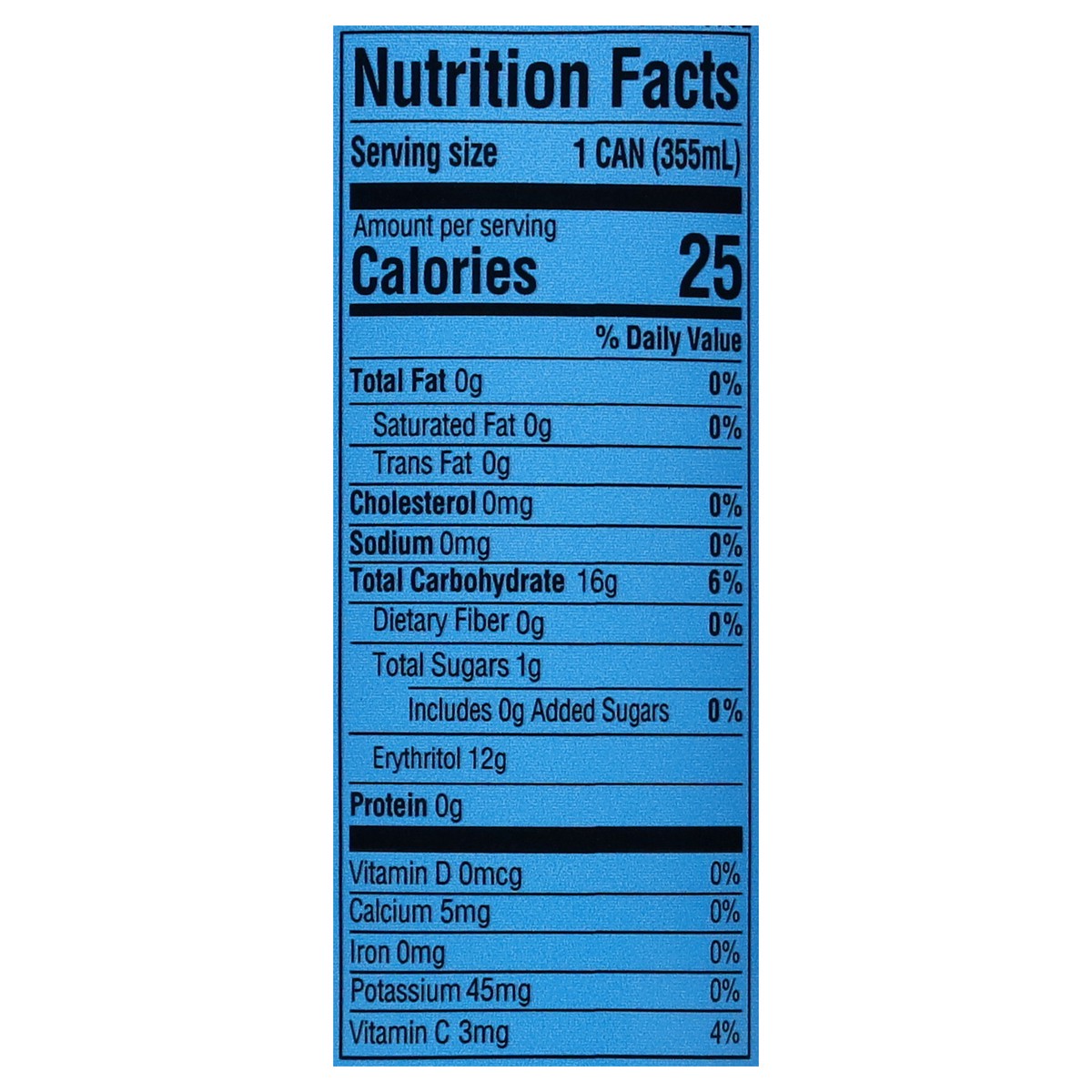 Filtered Carbonated Water, Organic Erythritol, Natural Flavors, Raspberry Juice Concentrate, Blueberry Juice Concentrate, Citric Acid, Malic Acid, Caffeine from Green Tea Extract, Monk Fruit Extract, …