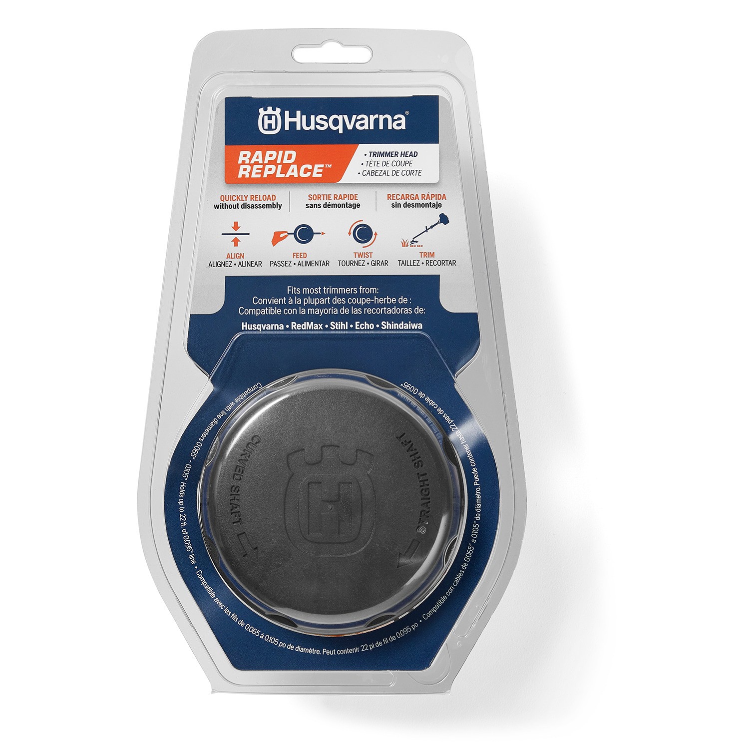 Husqvarna Rapid replace™ trimmer head simplifies the trimmer line reloading process. Holds up to 22 feet of 0.095 string trimmer line for extended runtime. Designed for long-lasting durability. Includ…