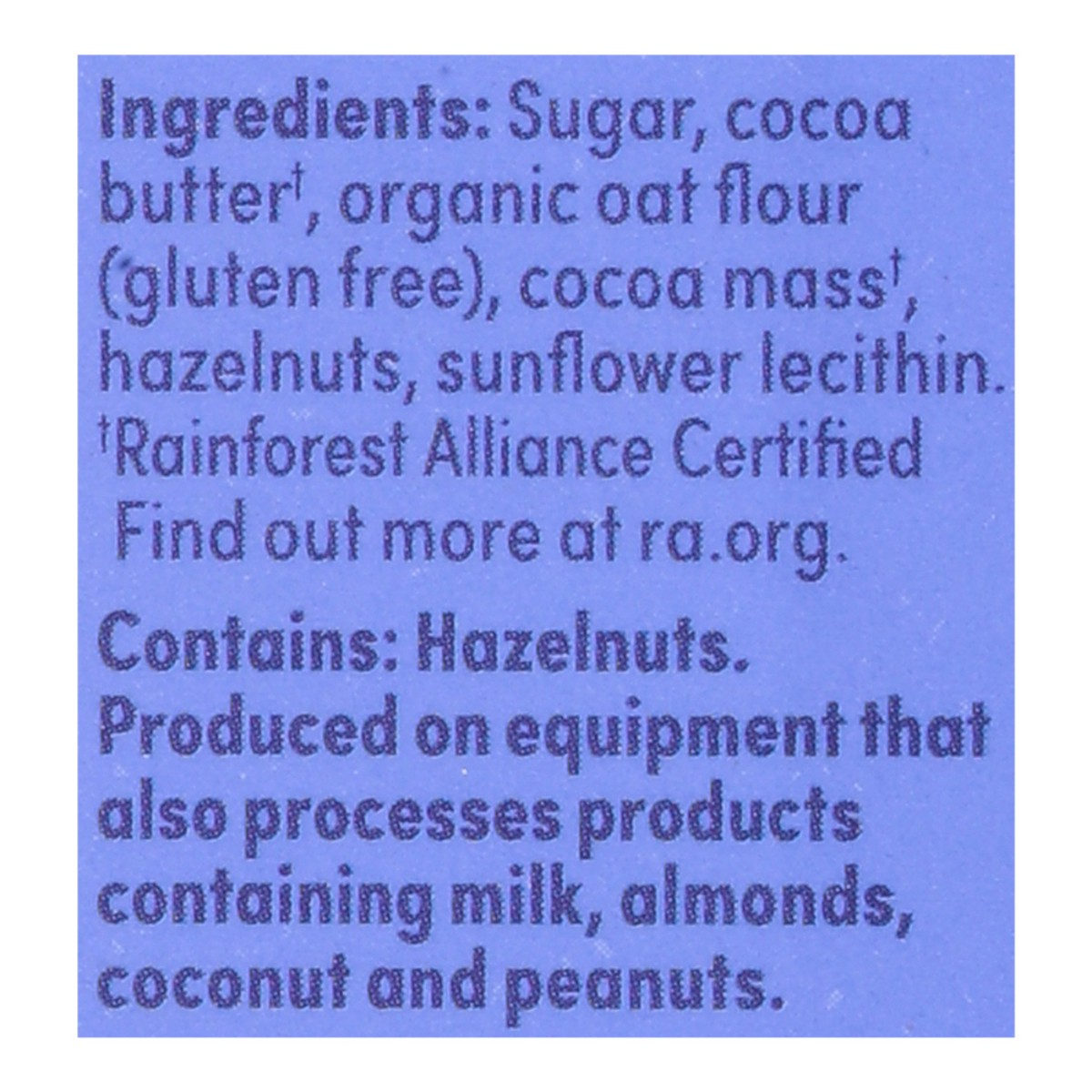 Sugar, Cocoa Butter (Rainforest Alliance Certified Find Out More at ra.org), Organic Oat Flour (Gluten Free), Cocoa Mass (Rainforest Alliance Certified Find Out More at ra.org), Hazelnuts, Sunflower L…