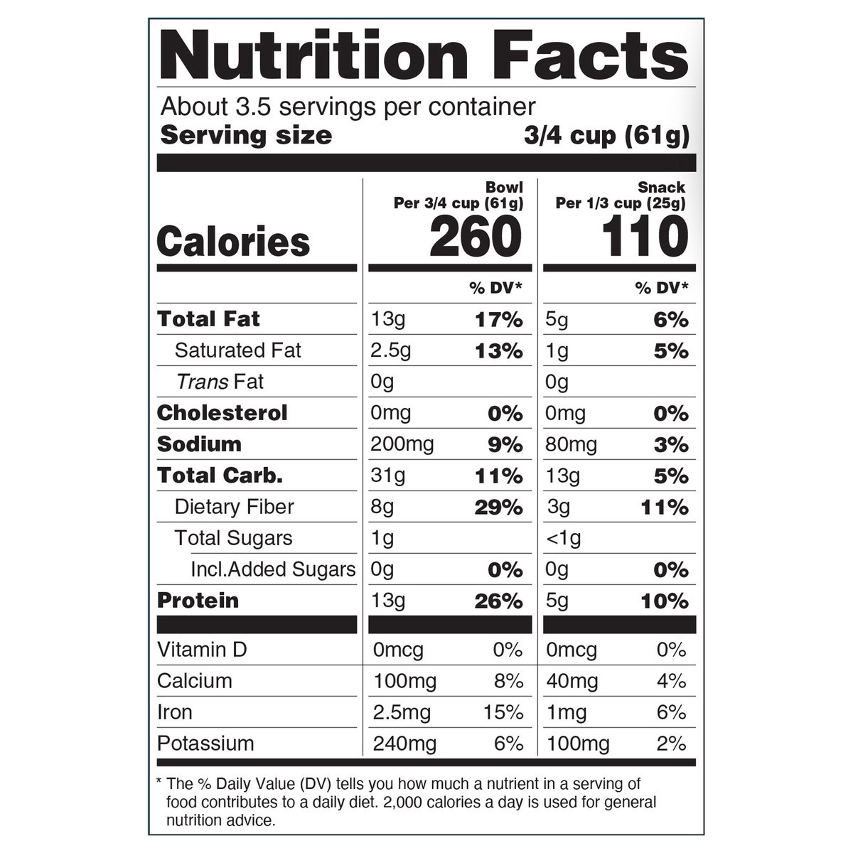 Dry Roasted Almonds, Crisp Whole Oats, Crisp Brown Rice, Soy Crisps (Soy Protein, Tapioca Starch), Catalina Cereal (Pea Protein, Tapioca Starch, Potato Fiber, Corn Fiber, Chicory Root Fiber, Caramel C…
