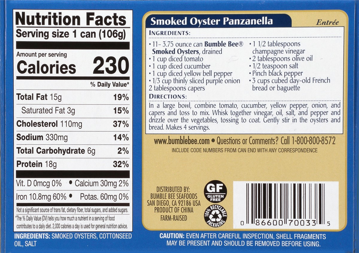 Gluten free. Easy open. www.bumblebee.com. Questions or comments? Call 1-800-800-8572. Include code numbers from can end with any correspondence. 100% recyclable packaging. Product of China.