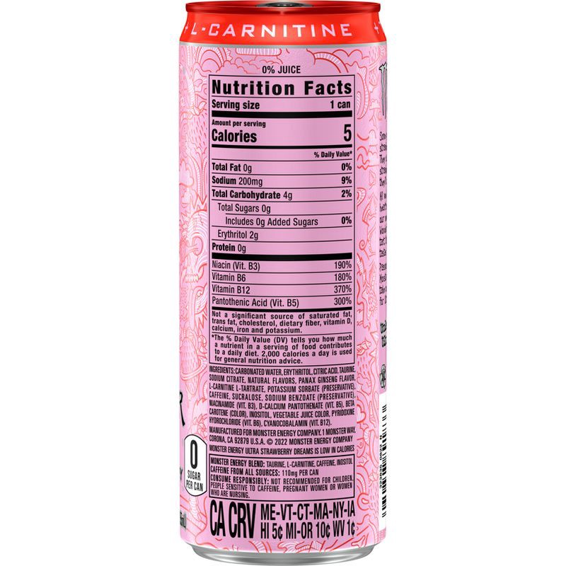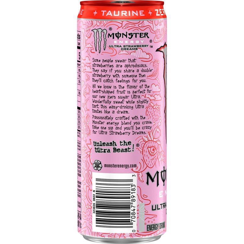 - FULL FLAVOR, ZERO SUGAR: Monster Energy Ultra Strawberry Dreams energy drink delivers zero sugar with all the bold flavor you love, packed with our sugar-free Monster Energy blend to fuel your adventures.