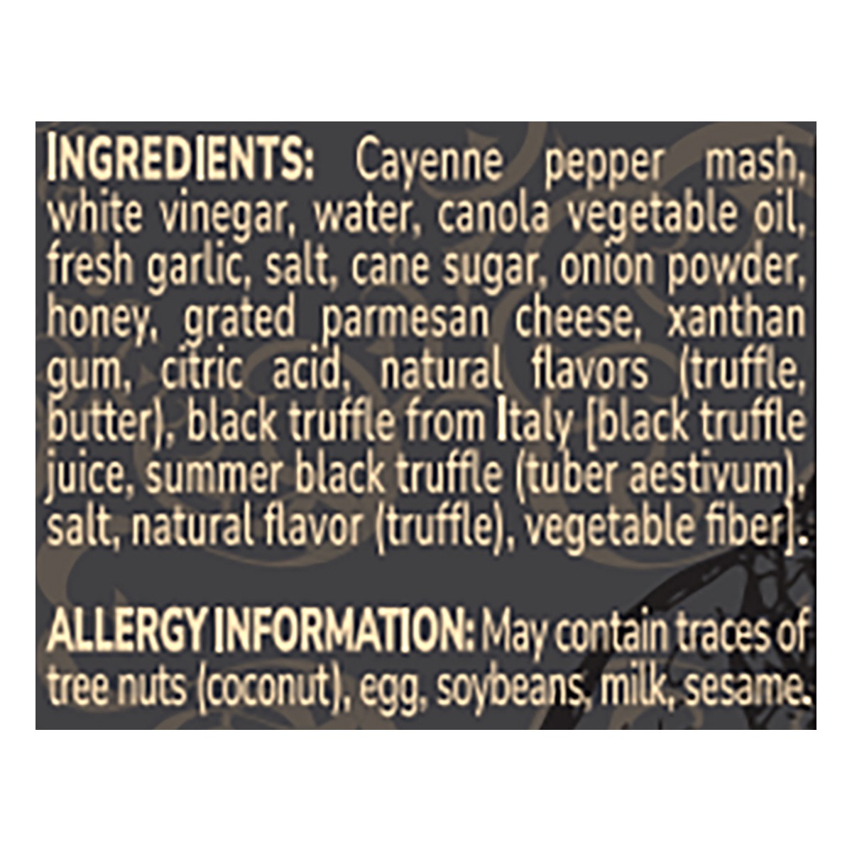 Cayenne Pepper Mas, Vinegar, Water, Canola Vegetable Oil,Fresh Garlic, Salt, Cane Sugar, Onion Powder, Honey, Grated Parmesan, Xanthan Gum, Citric Acid, Natural Flavors, (Truffle Butter,) Black Truffl…