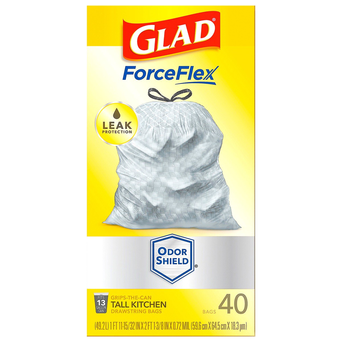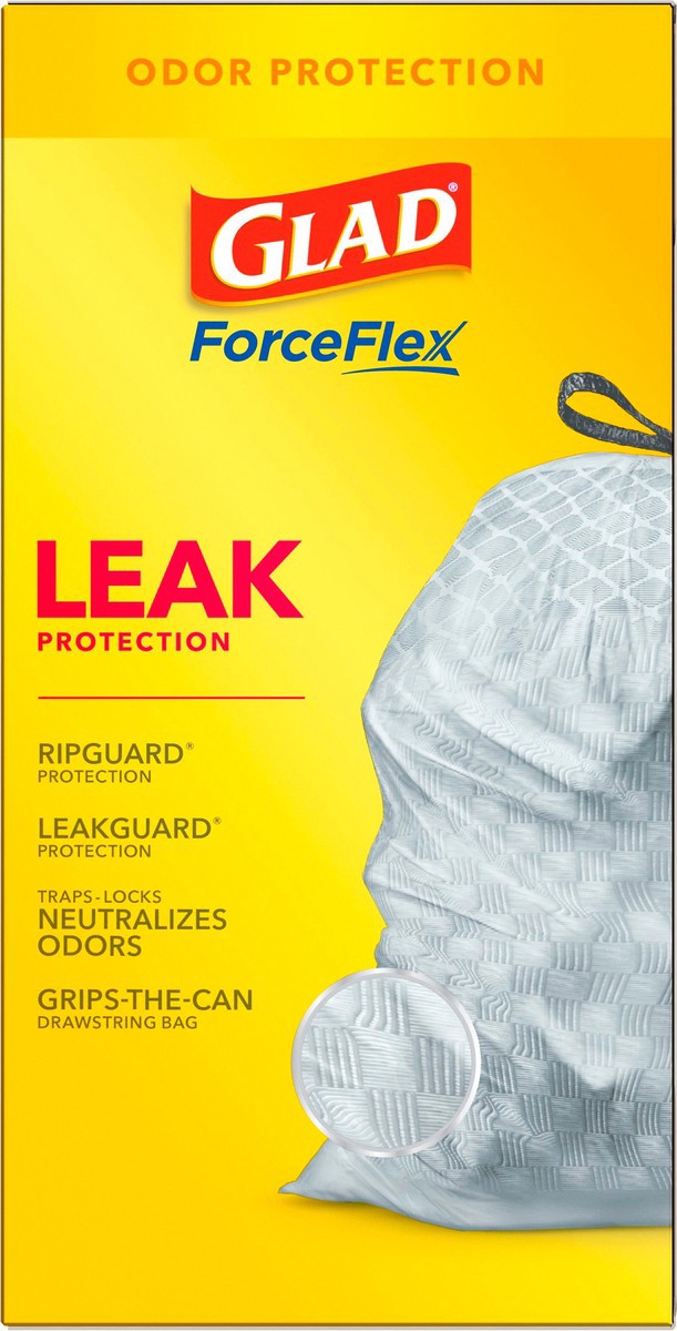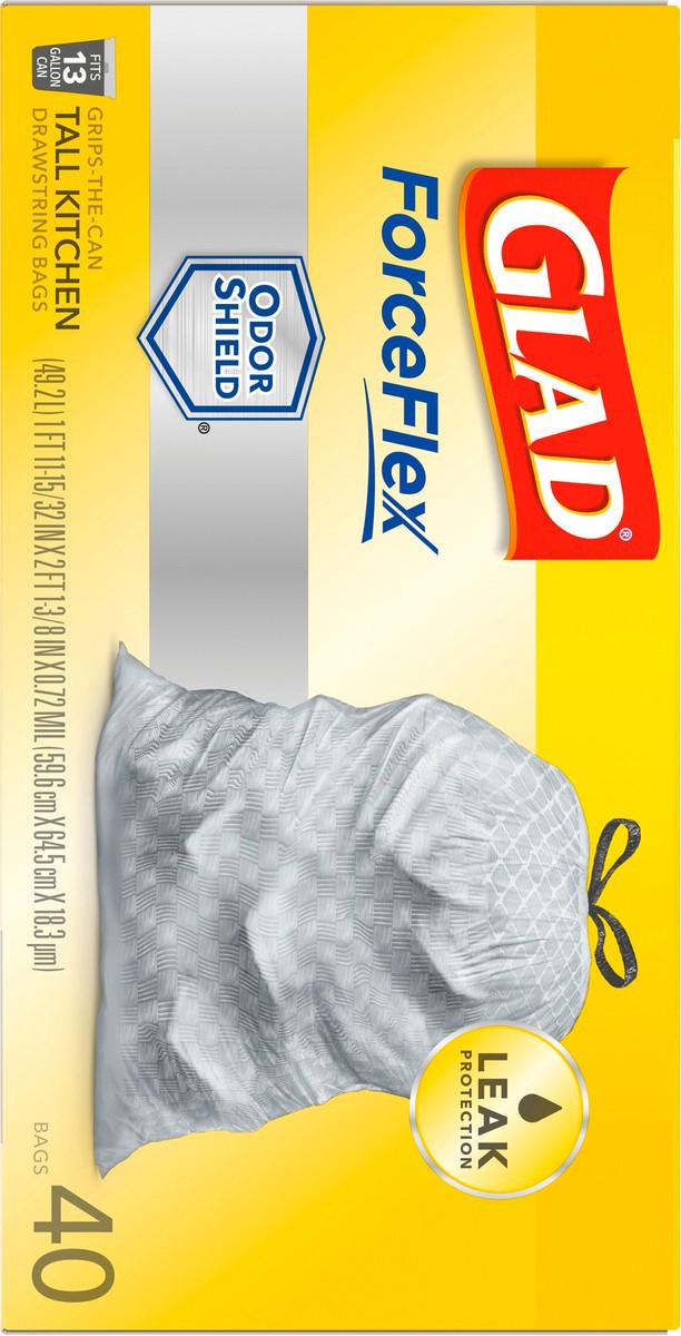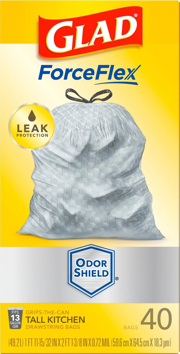 - 13 GALLON PLASTIC TRASH BAGS: Kitchen trash has never smelled better. Glad ForceFlex Kitchen trash bags with odor protection continuously neutralizes odors; Packaging May Vary