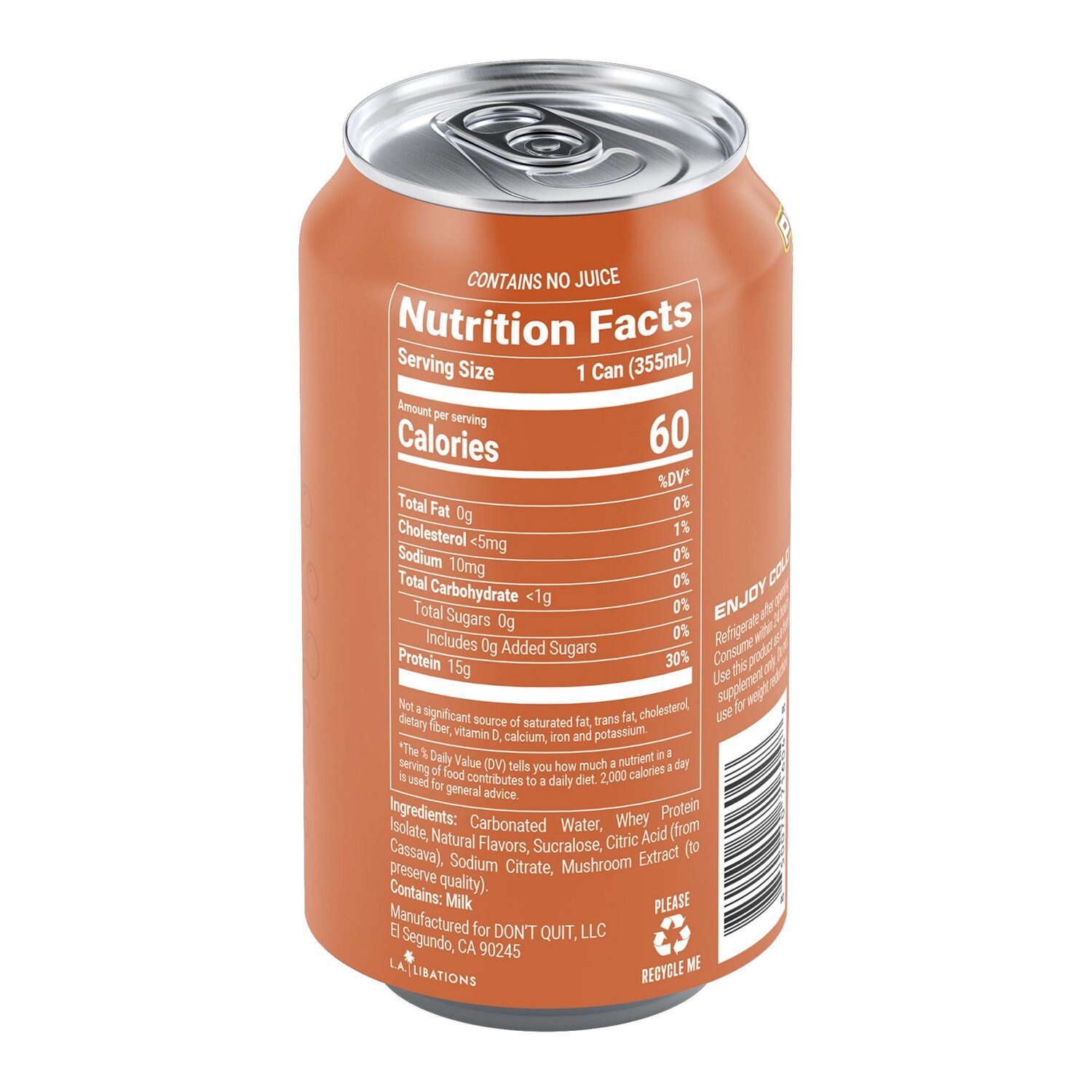 Carbonated Water, Whey Protein Isolate, Natural Flavors, Fruit and Vegetable Juice (for color), Sucralose, Citric Acid, Mushroom Extract (to protect quality), Sodium Citrate.