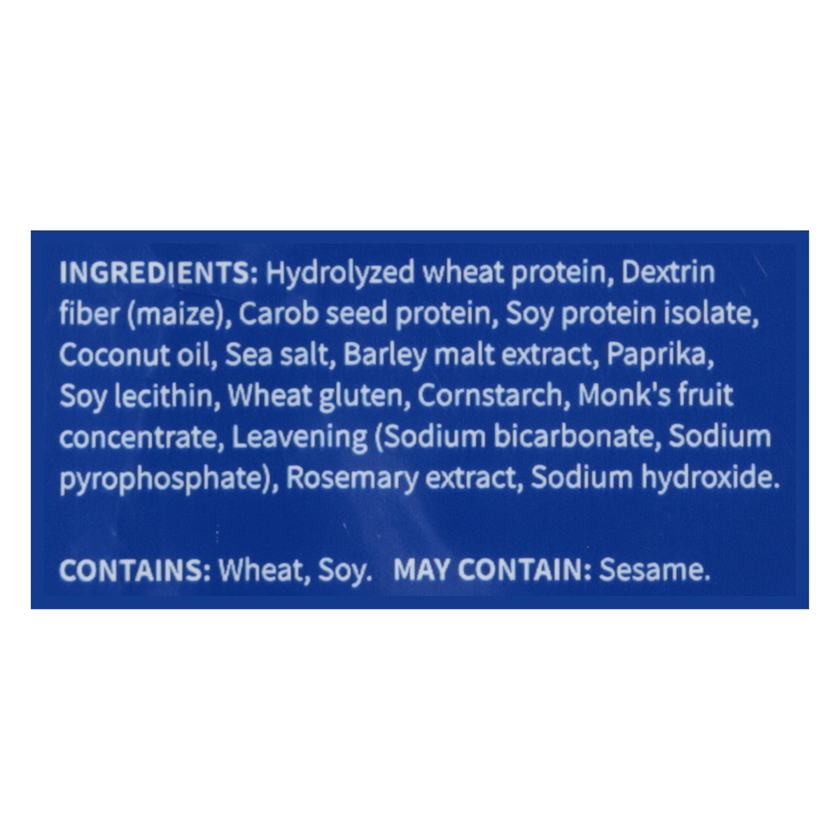 Hydrolyzed Wheat Protein, Dextrin Fiber (Maize), Carob Seed Protein, Soy Protein Isolate, Coconut Oil, Sea Salt, Barley Malt Extract, Paprika, Soy Lecithin, Wheat Gluten, Cornstarch, Monk''s Fruit Con…
