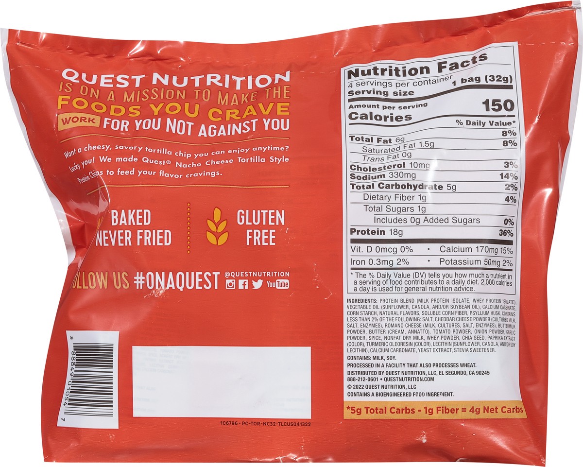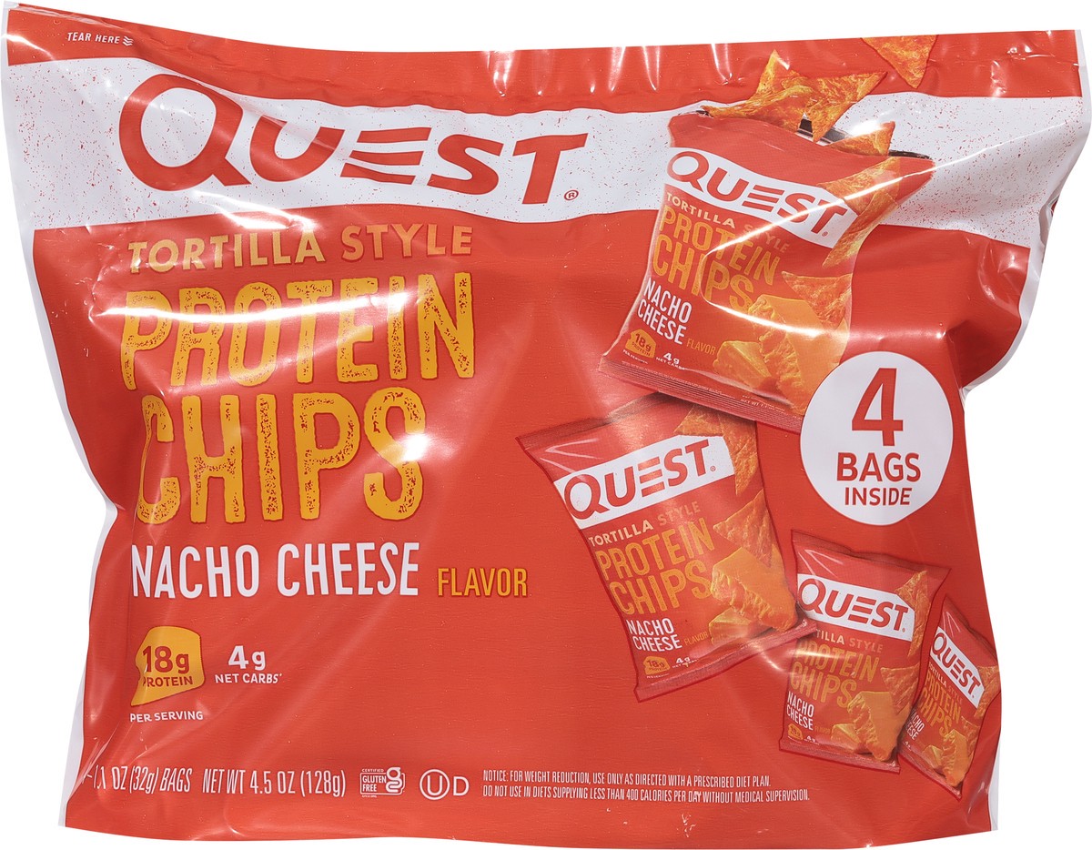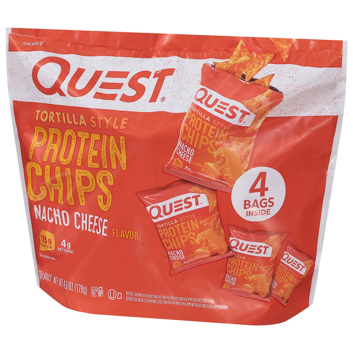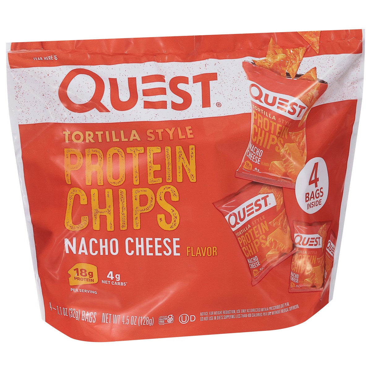 - ENJOY MORE. CARB LESS: The Quest Nacho Cheese Tortilla Style Protein Chips provide all the crunch and satisfying taste of a regular tortilla chip. Only ours have 18g of protein and 4g net carbs per bag