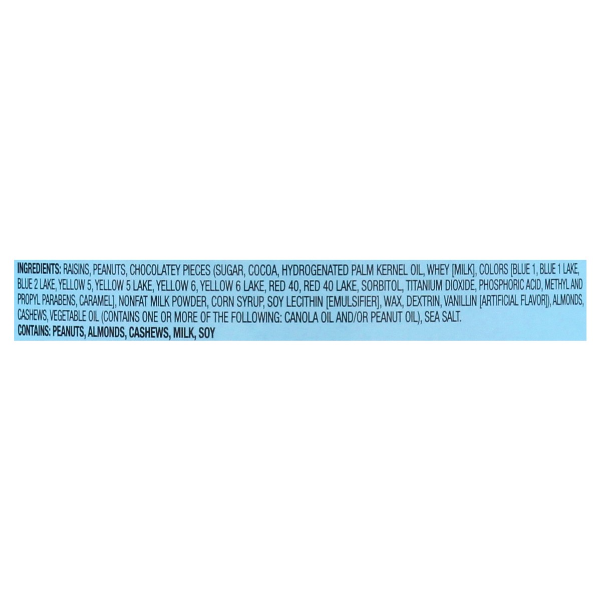 Raisins, Peanuts, Chocolatey Pieces (Sugar, Cocoa, Hydrogenated Palm Kernel Oil, Whey [Milk], Colors (Blue 1, Blue 1 Lake, Blue 2 Lake, Yellow 5, Yellow 5 Lake, Yellow 6, Yellow 6 Lake, Red 40, Red 40…