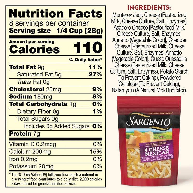 - Sargento® Shredded 4 Cheese Mexican, Traditional Cut is always shredded fresh from blocks of 100% real, natural cheese