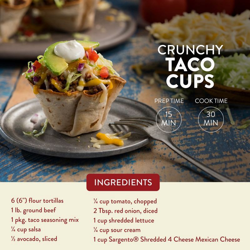 - Sargento® 4 Cheese Mexican Shredded Natural Cheese adds smooth, creamy flavor to all of your favorite Tex-Mex recipes like, quesadillas, tacos, and enchiladas