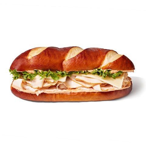 Oven roasted chicken, white cheddar cheese, spicy reduced fat mayonnaise and green leaf lettuce on a pretzel sub roll