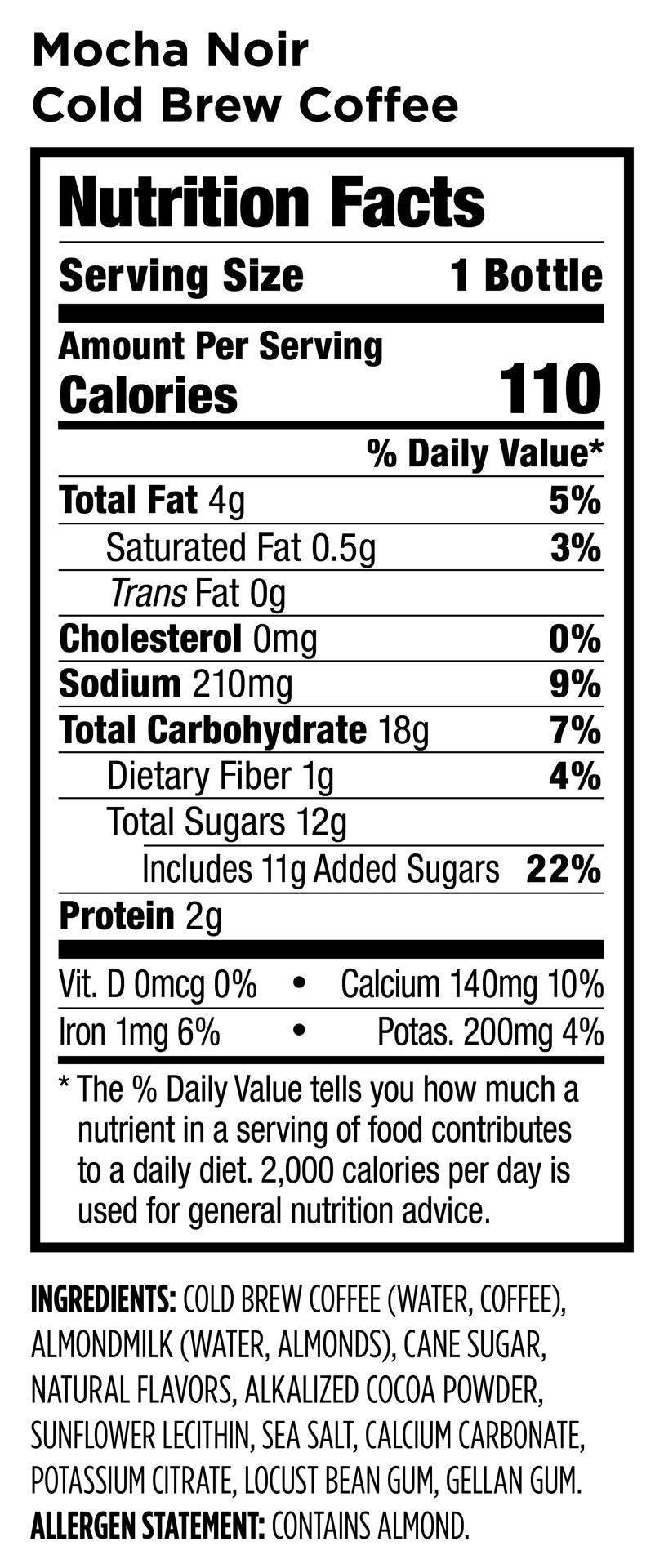 Cold Brew Coffee (Water, Coffee), Almondmilk (Water, Almonds), Cane Sugar, Alkalized Cocoa Powder, Natural Flavors, Potassium Citrate, Calcium Carbonate, Sea Salt, Sunflower Lecithin, Monk Fruit Conce…