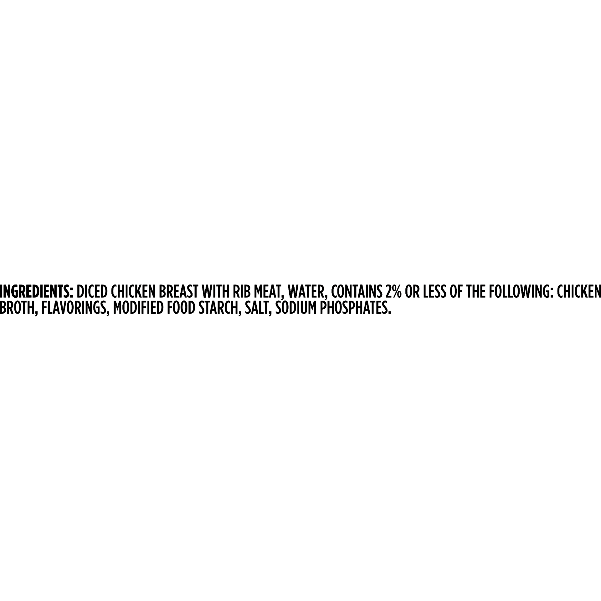 Diced chicken breast with rib meat, water, contains 2% or less of the following: chicken broth, flavorings, modified food starch, salt, sodium phosphates.