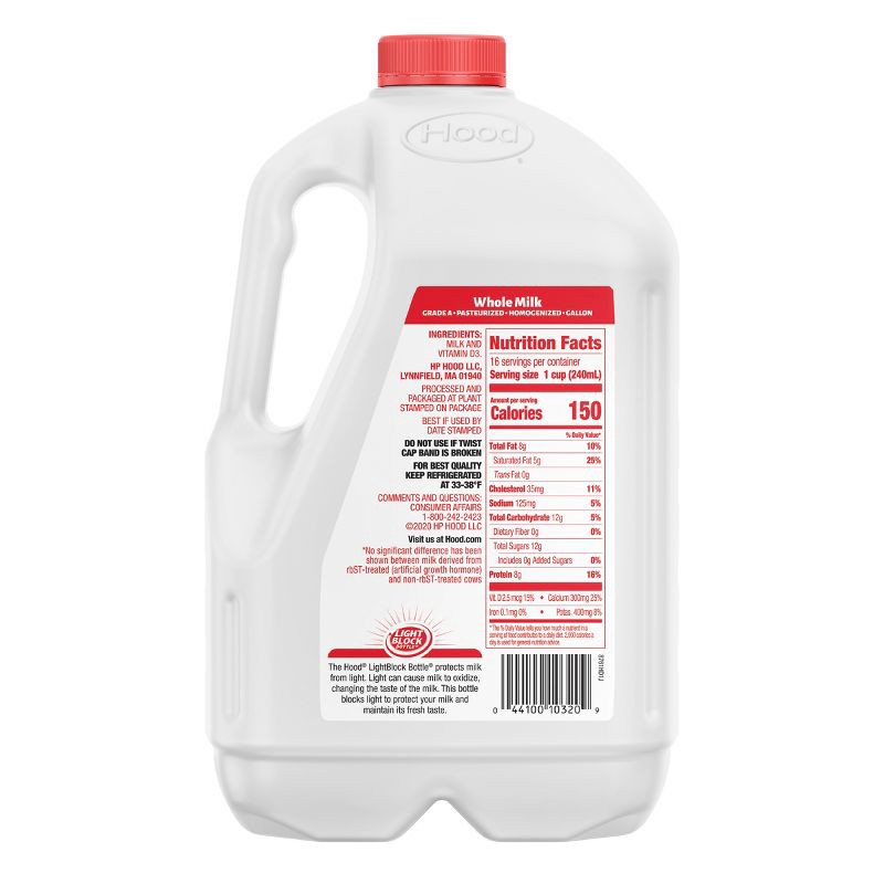 Hood® Whole Milk in the LightBlock Bottle® is fresh, delicious and provides nutrients your family needs. An 8-ounce serving provides 8 grams of protein, is an excellent source of calcium, and a good s…