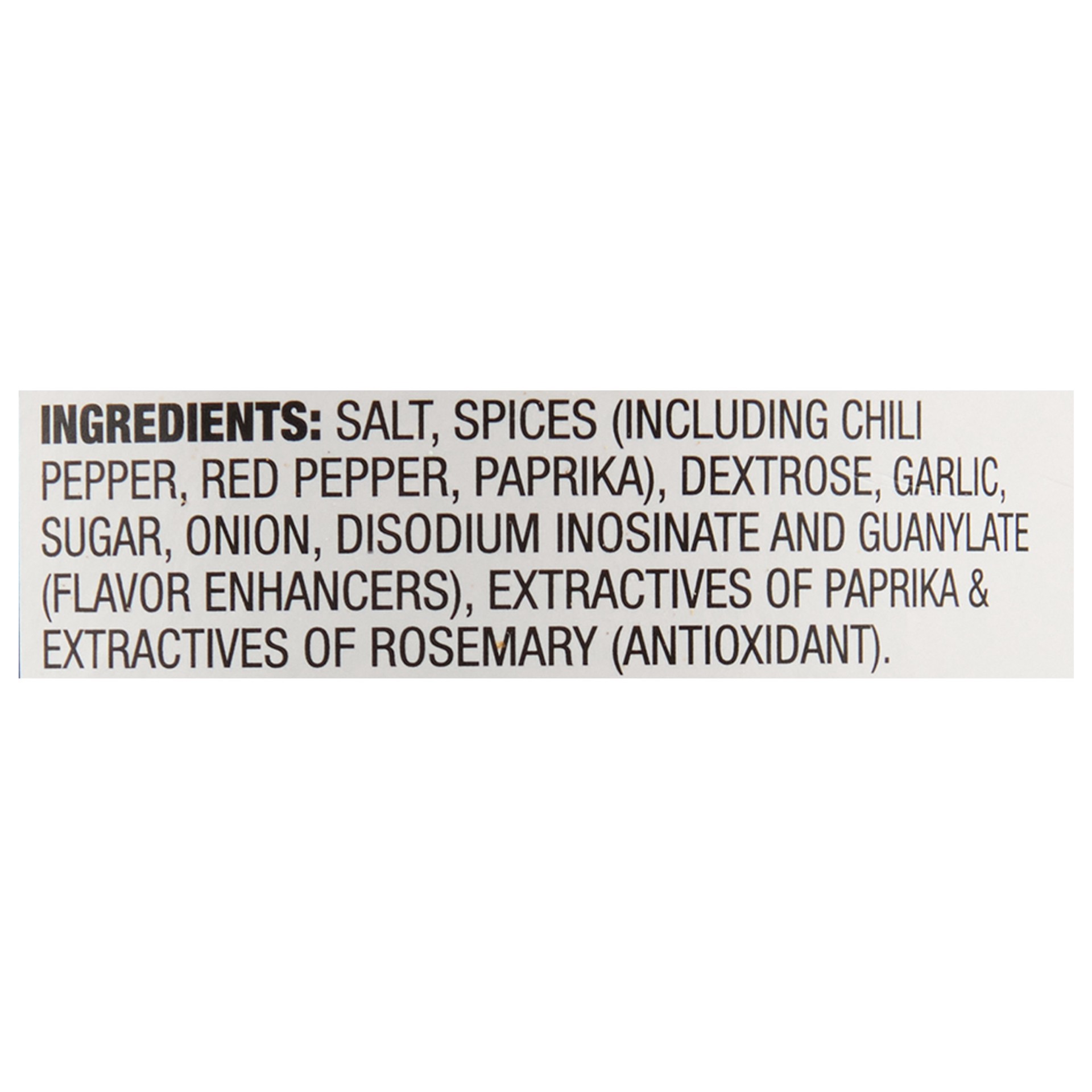 Salt, Spices (Including Chili Pepper, Red Pepper and Paprika), Dextrose, Garlic, Sugar, Onion, Disodium Inosinate & Guanylate (Flavor Enhancers), Extractives of Paprika, and Extractives of Rosemar…