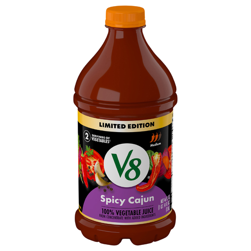 Savor the goodness of V8 Spicy Cajun 100% Vegetable Juice. This spicy V8 juice is made with concentrated tomato juice and the juices of seven other vegetables, plus chili pepper and black pepper extra…